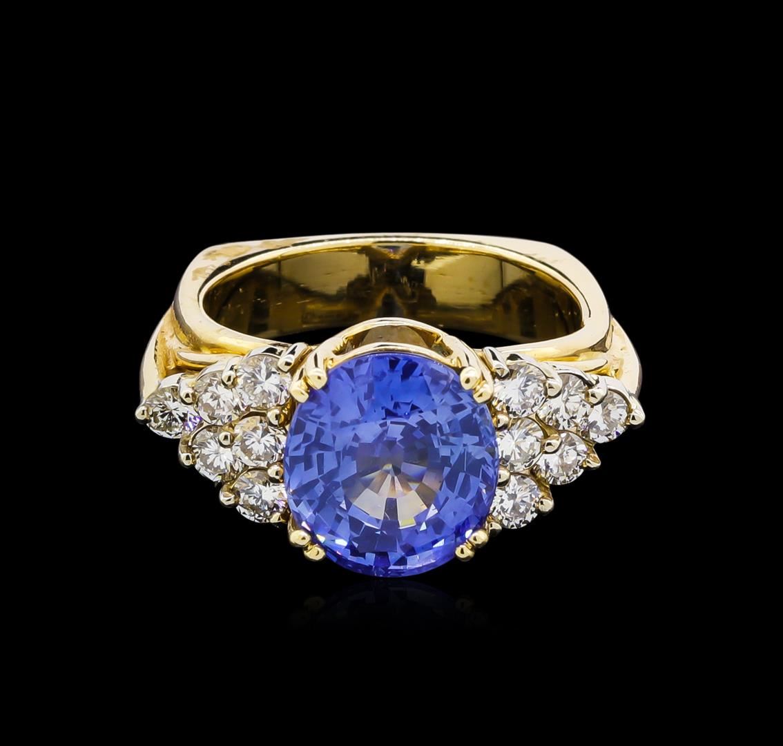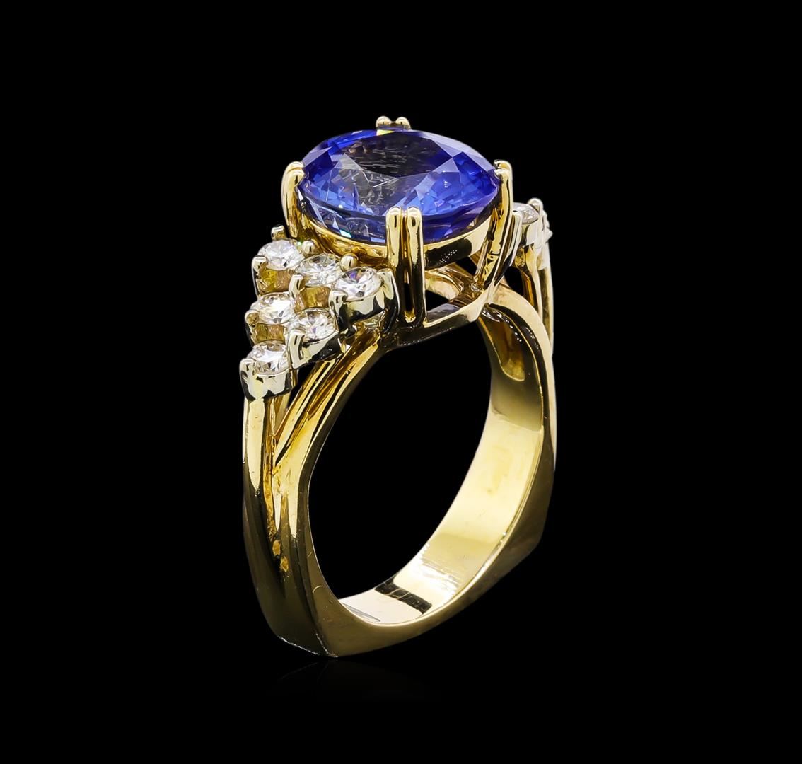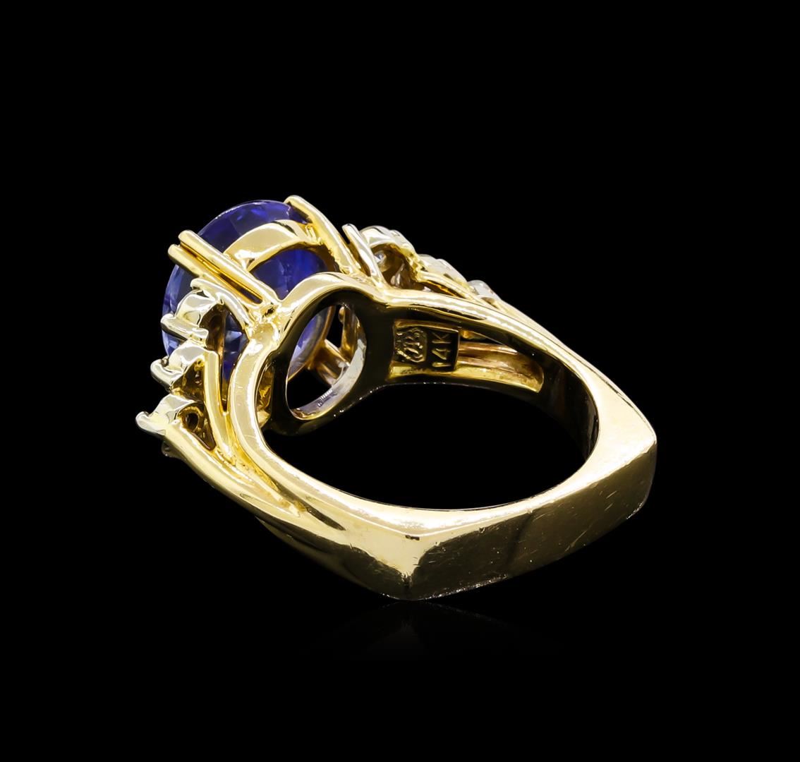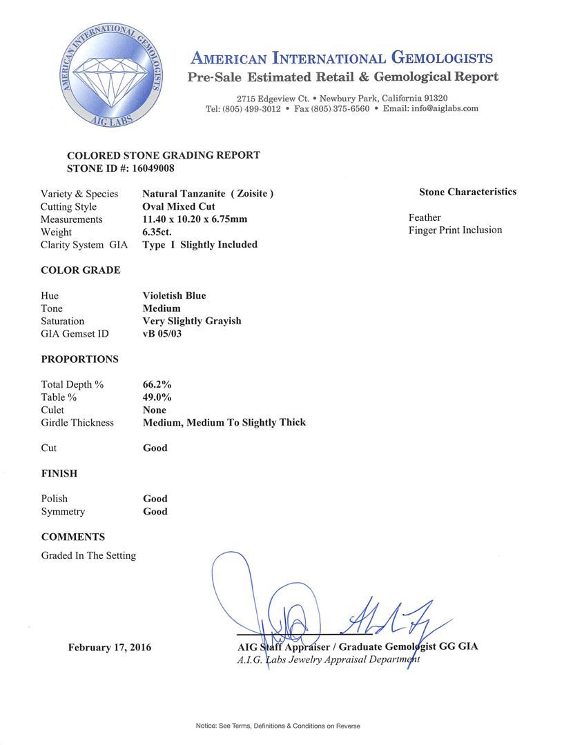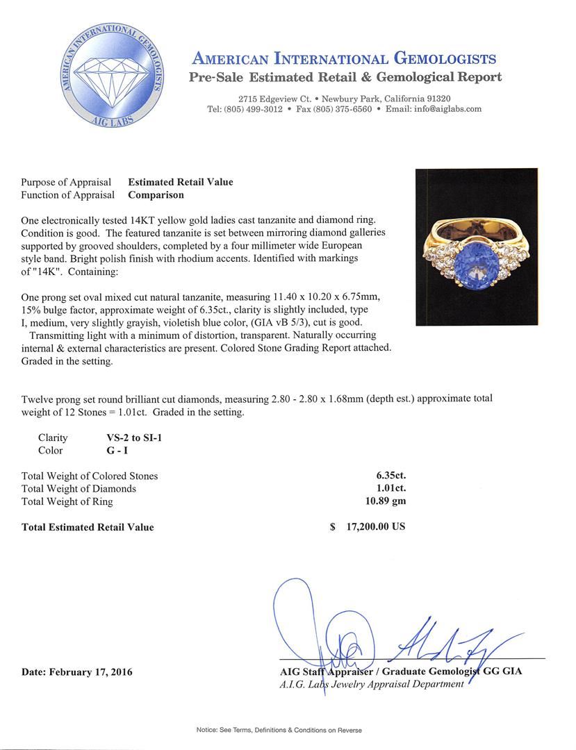 One electronically tested 14KT yellow gold ladies cast tanzanite and diamond ring. The featured tanzanite is set between mirroring diamond galleries supported by grooved shoulders, completed by a four millimeter wide European style band. Bright polish finish with rhodium accents. Identified with markings of "14K". Condition is good. Containing: One prong set oval mixed cut natural tanzanite, measuring 11.40 x 10.20 x 6.75mm, 15%. bulge factor, approximate weight of 6.35ct., clarity is slightly included, type I, medium, very slightly grayish, violetish blue color, (GIA vB 5/3), cut is good. Transmitting light with a minimum of distortion, transparent. Naturally occurring internal & external characteristics are present. Colored Stone Grading Report attached. Graded in the setting. Twelve prong set round brilliant cut diamonds, measuring 2.80 - 2.80 x 1.68mm (depth est.) approximate total weight of 12 Stones = 1.01ct. Graded in the setting. Clarity: VS-2 to SI-1. Color: G - I. Total Weight of Colored Stones 6.35ct. Total Weight of Diamonds 1.01ct. Total Weight of Ring 10.89gm. AIG Appraised at $17,200.00.