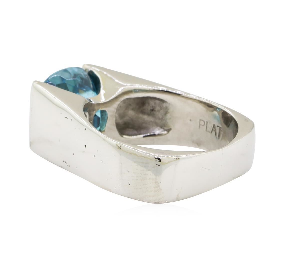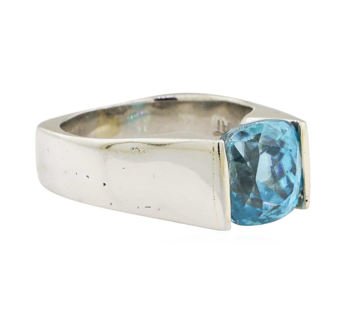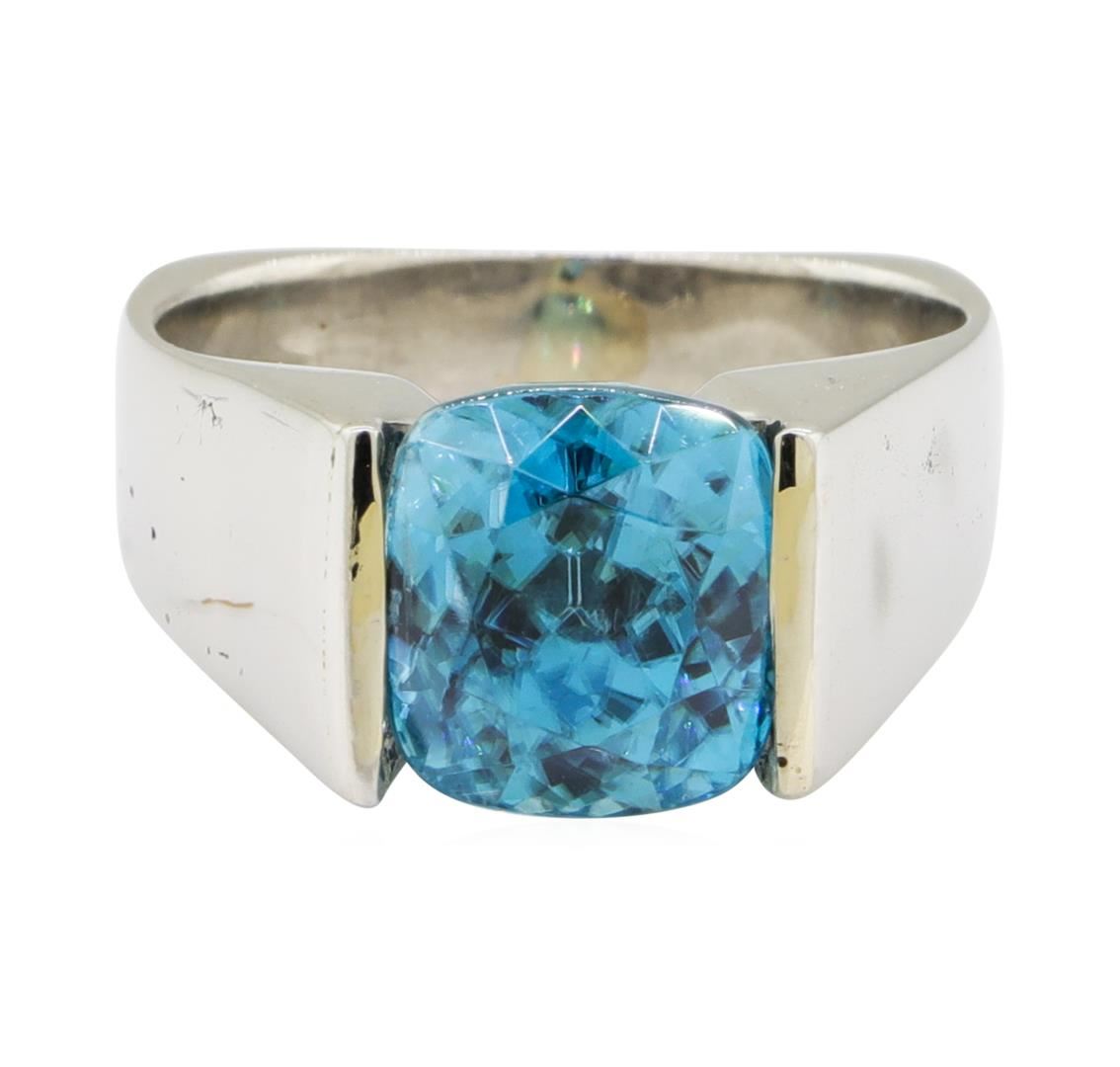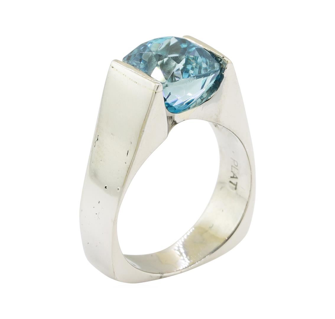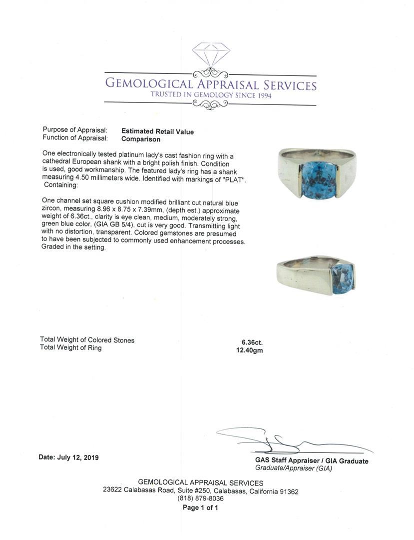One electronically tested platinum lady's cast fashion ring with a cathedral European shank with a bright polish finish. The featured lady's ring has a shank measuring 4.50 millimeters wide. Identified with markings of 'PLAT'. Condition is used, good workmanship. Containing: One channel set square cushion modified brilliant cut natural blue zircon, measuring 8.96 x 8.75 x 7.39mm, (depth est.) approximate weight of 6.36ct., clarity is eye clean, medium, moderately strong, green blue color, (GIA GB 5/4), cut is very good. Transmitting light with no distortion, transparent. Colored gemstones are presumed to have been subjected to commonly used enhancement processes. Graded in the setting. Total Weight of Colored Stones 6.36ct.. Total Weight of Ring 12.40gm GAS Appraised at $5550.00. GAS Appraised at $12,575.00.
