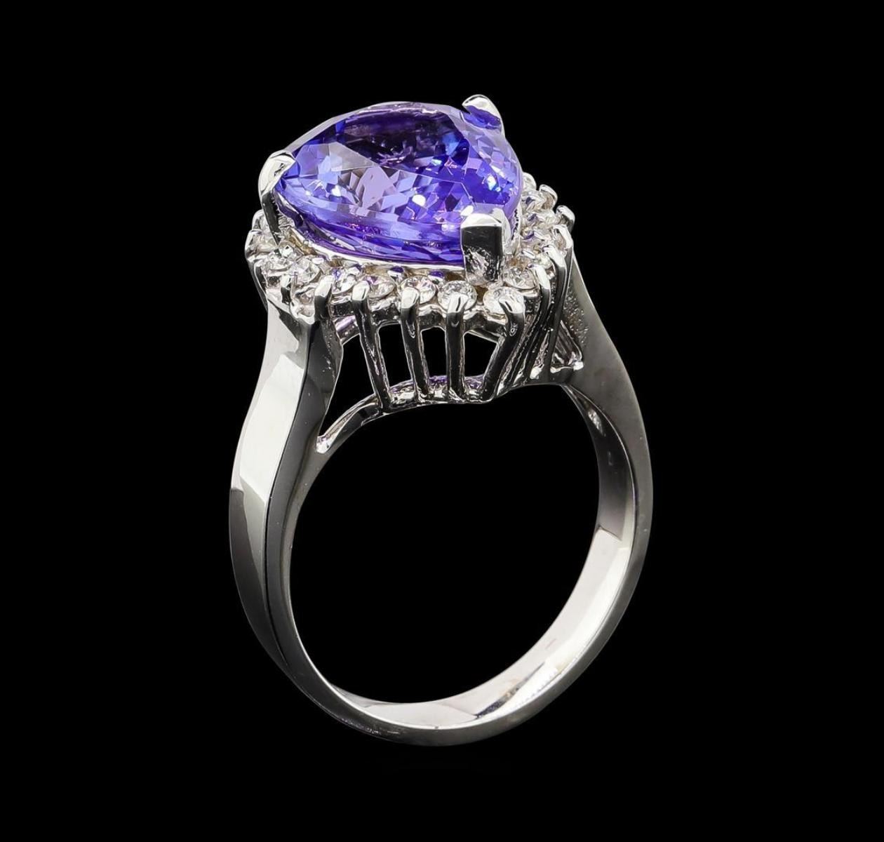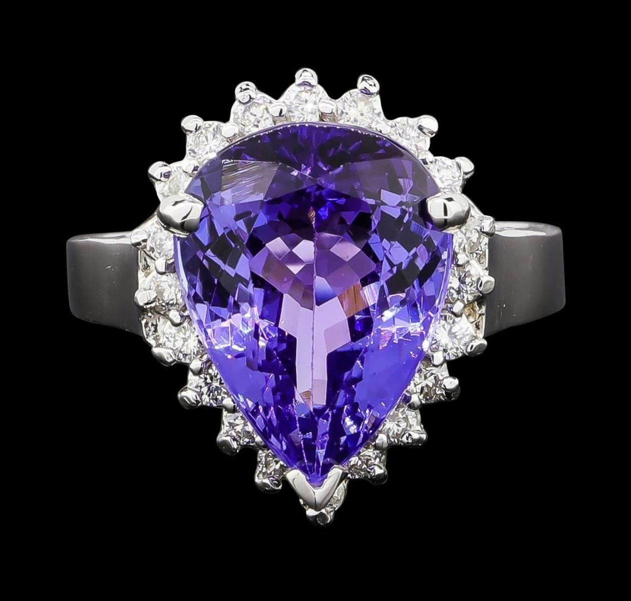 One electronically tested 14KT white gold lady's cast fashion ring with a basket halo with a bright polish finish. The featured lady's ring has a shank measuring 3.04 millimeters wide. Identified with markings of '14K'. Condition is new, good workmanship. Containing: One prong set pear modified brilliant cut natural tanzanite, measuring 13.93 x 10.70 x 6.59mm, (depth est.) approximate weight of 6.36ct., clarity is eye clean, medium, moderately strong, bluish violet color, (GIA bV 5/4), cut is very good. Transmitting light with no distortion, transparent. Colored gemstones are presumed to have been subjected to commonly used enhancement processes. Graded in the setting. Twenty prong set round brilliant cut diamonds, measuring 1.85 - 1.75 x 1.12mm (depth est.) approximate total weight of 20 Stones = 0.45ct. Graded in the setting. Clarity SI-1 to I-1. Color: H - I Cut Good. Total Weight of Colored Stones 6.36ct.. Total Weight of Diamonds 0.45ct.. Total Weight of Ring 7.40gm. GAS Appraised.