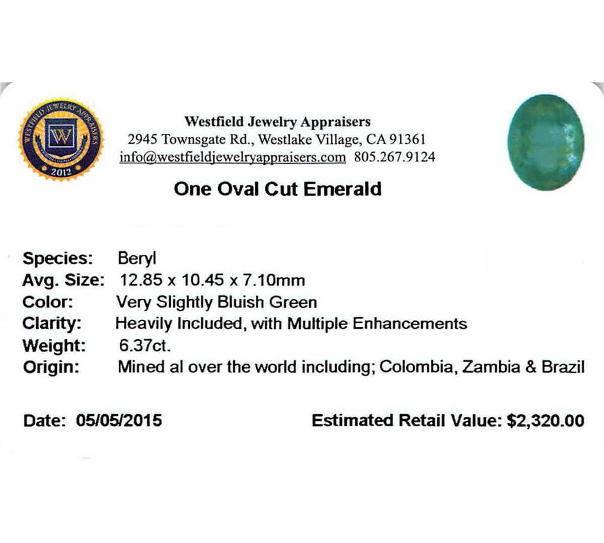 One oval mixed cut natural emerald, measuring 12.85 x 10.45 x 7.10mm, exact weight 6.37ct., clarity is heavily included, type III, medium dark, very slightly grayish, very slightly bluish green color, (GIA vslbG 6/3) Indications of multiple laboratory enhancements, including high temperature heat treatment. Westfield Appraised at $2,320.00.