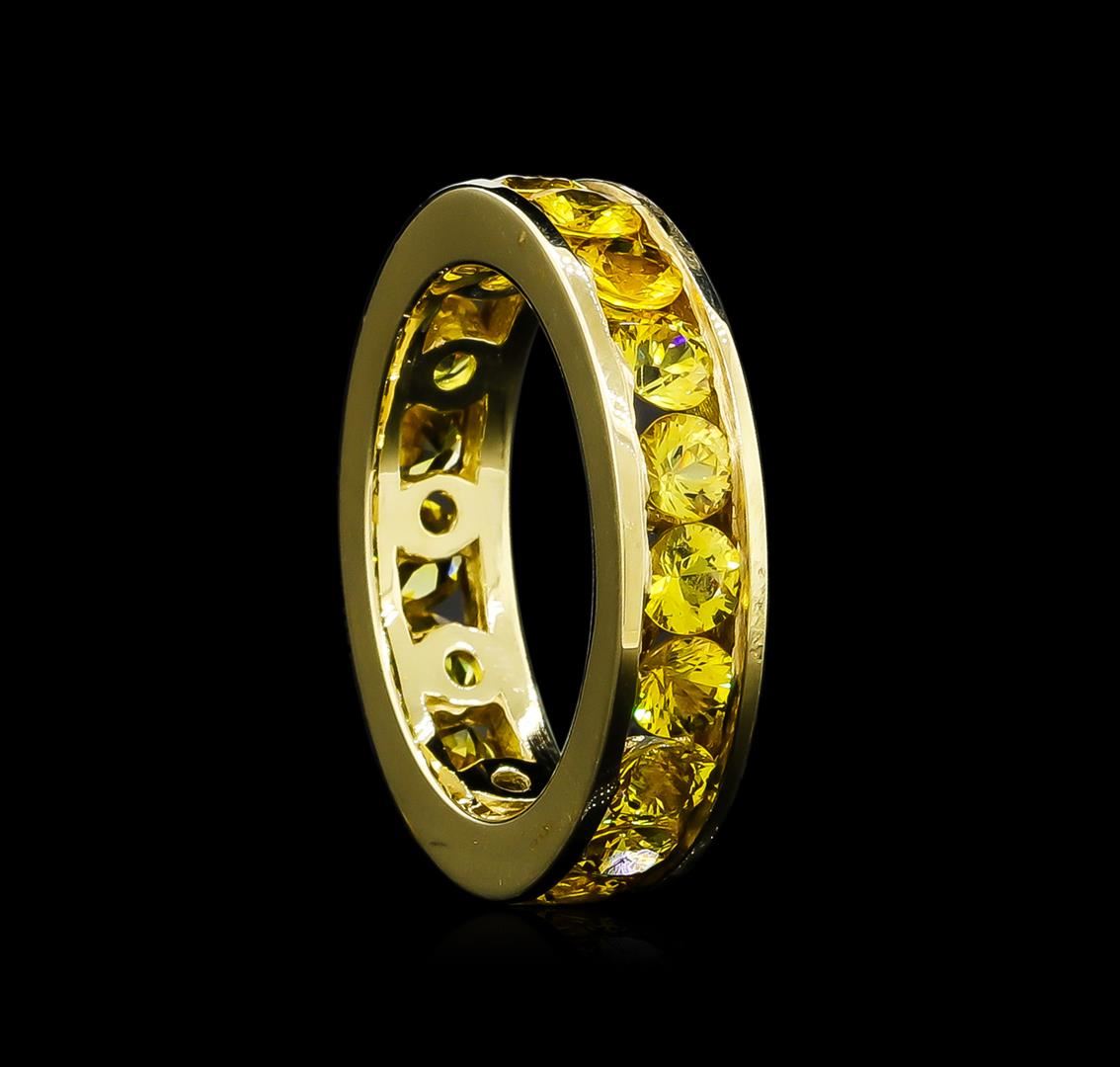 One electronically tested 14KT yellow gold cast yellow sapphire eternity ring with a bright polish finish. The ring features a continuous yellow sapphire ribbon in a five millimeter wide band. Ring size 8.25. Condition is good. Containing: Nineteen channel set round mixed cut natural yellow sapphires, measuring 4.00 - 3.90 x 2.57 mm, approximate total weight of 6.37ct., clarity is eye clean, type II, medium dark, moderately strong, yellow color, (GIA Y 6/4), cut is good. Transmitting light with no distortion, transparent. Color grade is an average for the group. Graded in the setting. Total Weight of Colored Stones 6.37ct. Total Weight of Ring 6.95gm. AIG Appraised at $4,230.00.