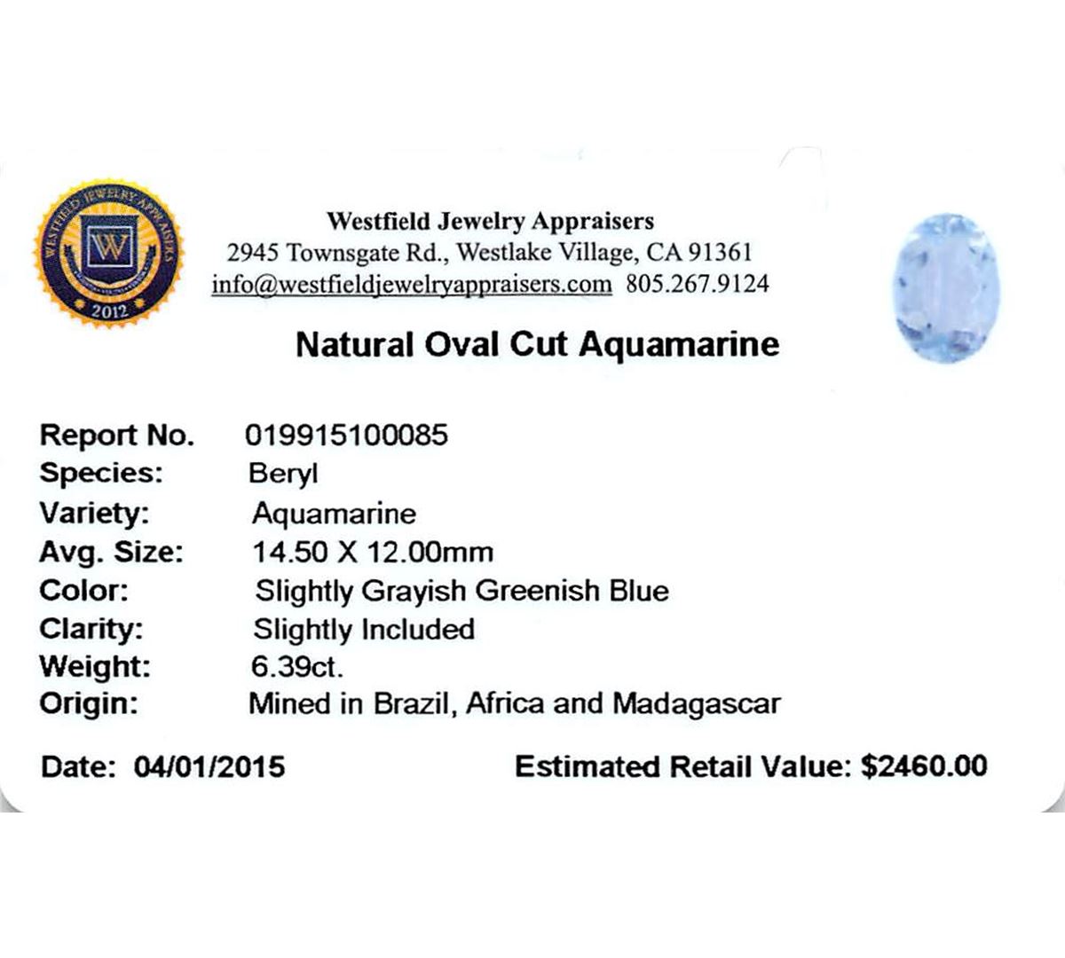 One oval cut natural aquamarine exact weight 6.39ct., clarity is slightly included, type I, medium light, very slightly grayish, very slightly greenish blue color, (GIA vslgB 4/3), cut is good. Westfield Appraised at $2,460.00.