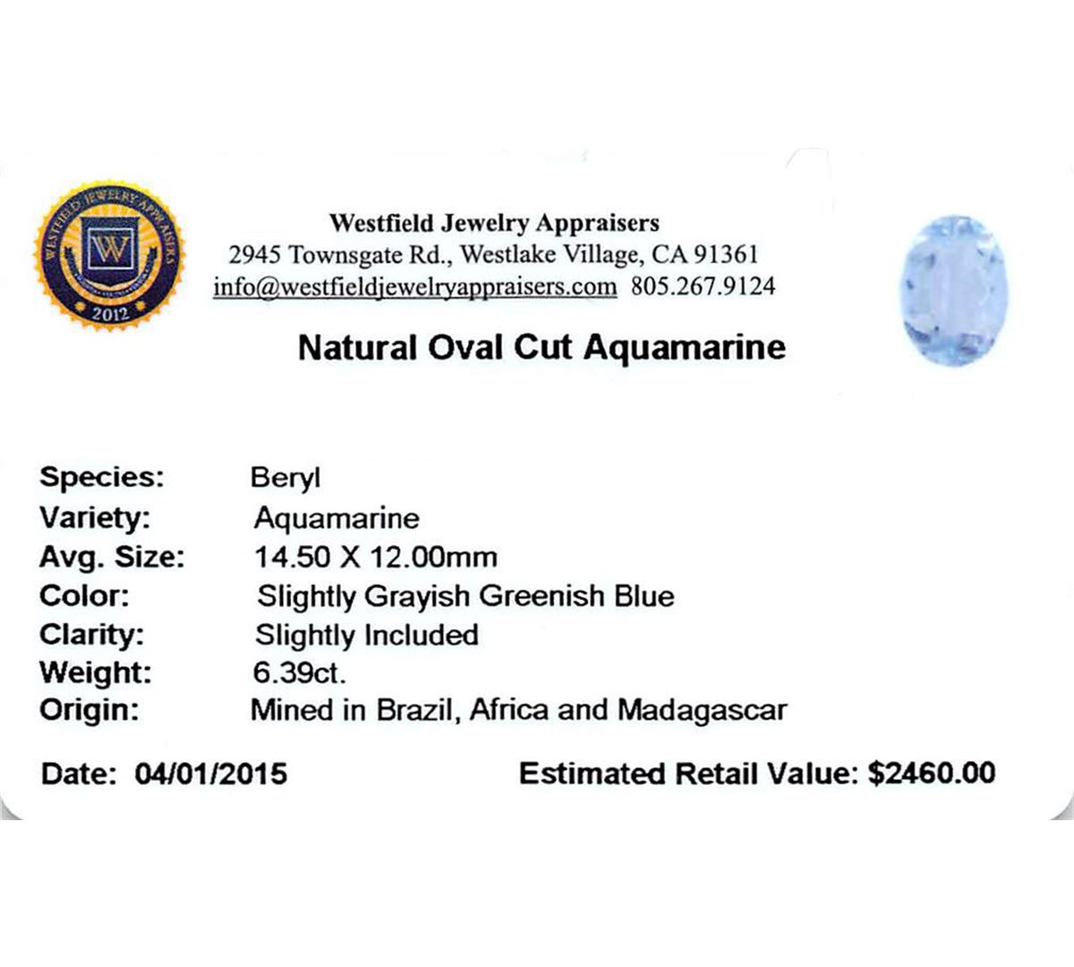 One oval cut natural aquamarine exact weight 6.39ct., clarity is slightly included, type I, medium light, very slightly grayish, very slightly greenish blue color, (GIA vslgB 4/3), cut is good. UGS Appraised at $2,460.00.