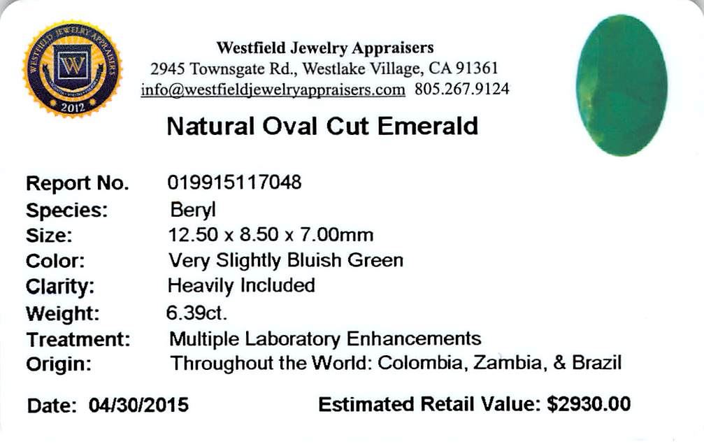 One oval mixed cut natural emerald exact weight 6.39ct., clarity is heavily included, type III, medium dark, very slightly grayish, very slightly bluish green color, (GIA vslbG 6/3), cut is good. Westfield Appraised at $2,930.00.