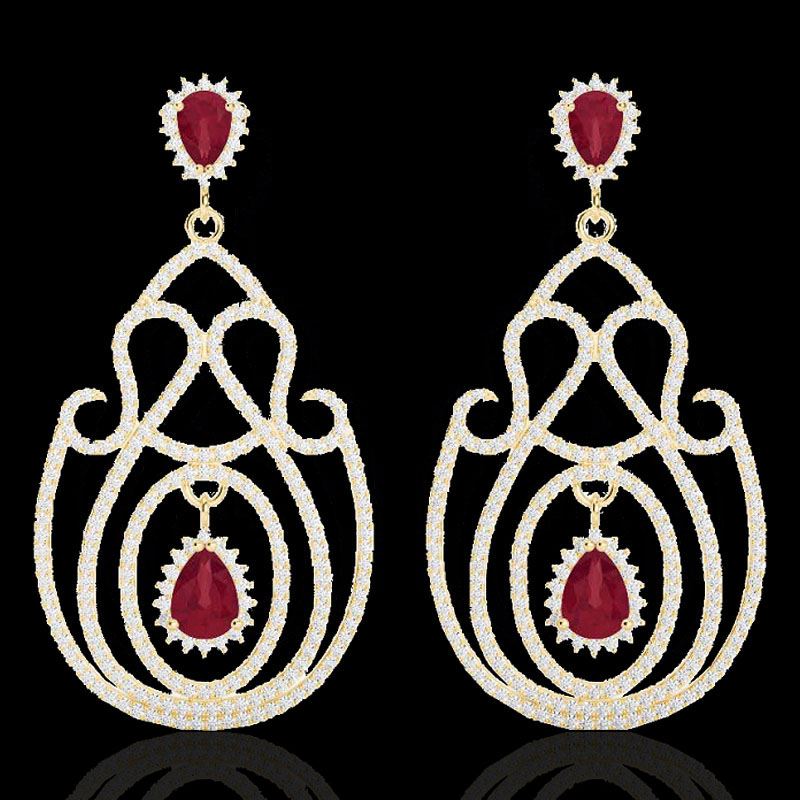 REF-303M5H -22428 ---- 6.40 CTW Ruby & Micro Pave VS/SI Diamond Earrings 14K Yellow Gold ---- Luxury Designer Brand Earring Appraised at $21,700 Certificate Number US22428 14k Yellow gold, Earring Size is 1 3/4 Inches, Earring measuring approx. 1 3/4"X 1" , weighing in total approx. 13 grams. Made in the USA and is stamped 14k, Main stone 1.4 carat total weight containing 2 pieces of Mid-Opaque-Deep Red color with AAA quality Pear shape cut Ruby , Stone #2 1 carat total weight containing 2 pieces of Strong Red color with Mid-Opaque quality Pear shape cut Ruby , Stone #3 4 carat total weight containing 458 pieces of G-H color with VS/SI quality Round shape cut Diamond