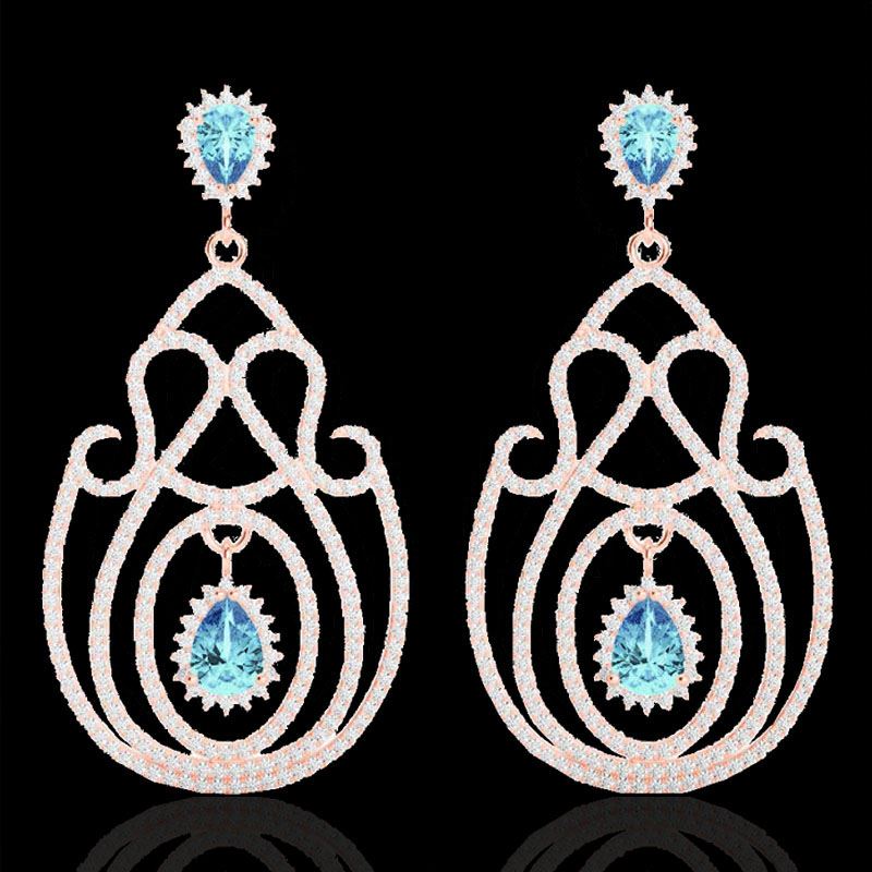 REF-303H5A -22432 ---- 6.40 CTW Topaz & Micro Pave VS/SI Diamond Designer Earrings 14K Rose Gold ---- Luxury Designer Brand Earring Appraised at $23,350 Certificate Number US22432 14k Rose gold, Earring Size is 1 3/4 Inches, Earring measuring approx. 1 3/4"X 1" , weighing in total approx. 13 grams. Made in the USA and is stamped 14k, Main stone 1.4 carat total weight containing 2 pieces of Translucent Blue color with AAA quality Pear shape cut Topaz , Stone #2 1 carat total weight containing 2 pieces of Translucent Sky Blue color with AAA quality Pear shape cut Topaz , Stone #3 4 carat total weight containing 458 pieces of G-H color with VS/SI quality Round shape cut Diamond