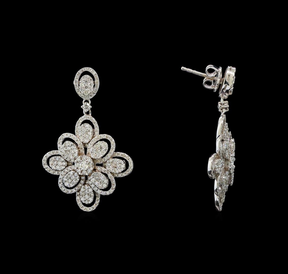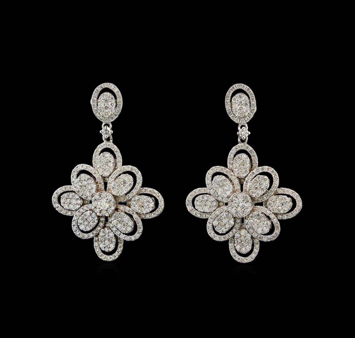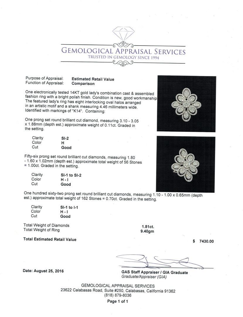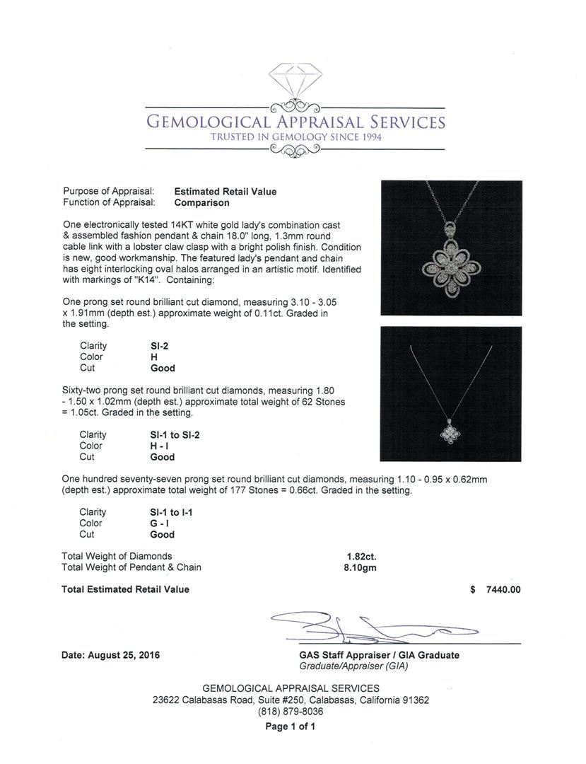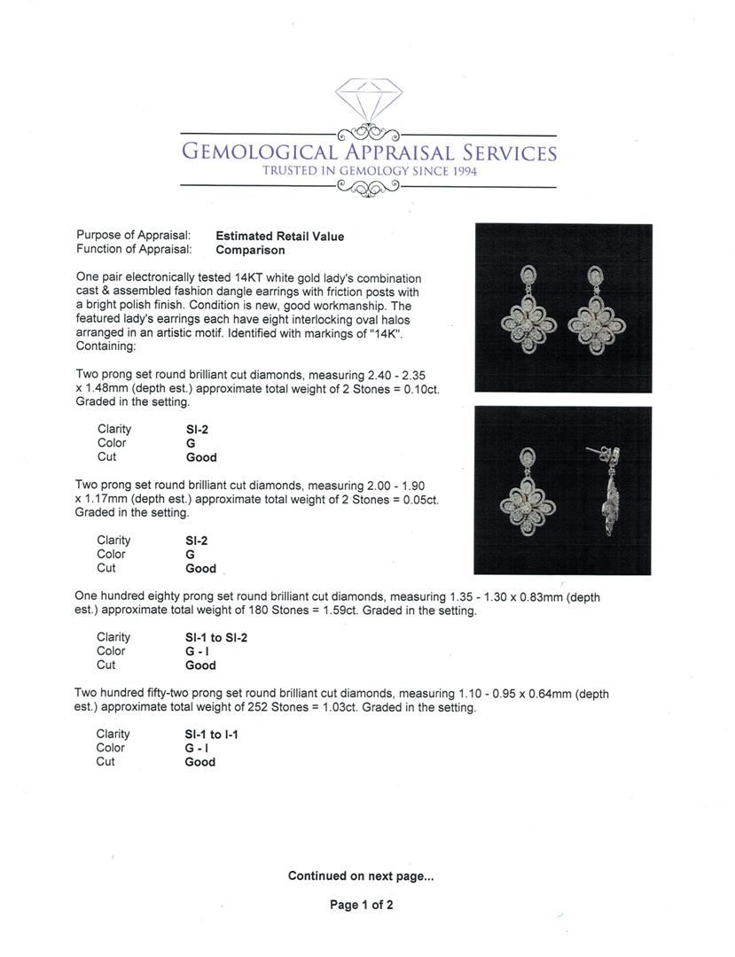 One electronically tested 14KT white gold ring, earrings, and necklace jewelry suite. The suite contains diamonds with a total weight of 6.40ct. Total Weight of Jewelry Suite: 26.80 grams. See appraisals for more info. GAS Appraised at $7,430.00.
