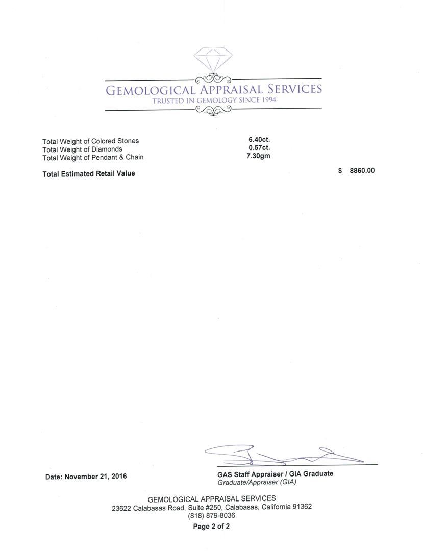 One electronically tested 14KT yellow gold lady's combination cast & assembled fashion pendant & chain 18.0' long, 1.9mm twisted oval shape link with a lobster claw clasp with a staggered double basket halo with a bright polish finish. Identified with markings of '14K'. Condition is new, good workmanship. Containing: One prong set oval modified mixed cut natural emerald, measuring 14.00 x 10.74 x 6.70mm, (depth est.) 12%. bulge factor, approximate weight of 6.40ct., clarity is heavily included, medium, moderately strong, green color, (GIA G 5/4), cut is good. Transmitting light somewhat diffusely, semi-transparent to translucent. Naturally occurring internal & external characteristics are present. Indications of oil residue. Colored gemstones are presumed to have been subjected to commonly used enhancement processes. Graded in the setting. Eight prong set round brilliant cut diamonds, measuring 2.10 - 2.05 x 1.29mm (depth est.) approximate total weight of 8 Stones = 0.27ct. Graded in the setting. Clarity SI-1 to SI-2. Color: G - H Cut Good Eight prong set round brilliant cut diamonds, measuring 1.90 - 1.80 x 1.11mm (depth est.) approximate total weight of 8 Stones = 0.18ct. Graded in the setting. Clarity VS-2 to SI-1. Color: G - H Cut Good Eight prong set round brilliant cut diamonds, measuring 1.60 - 1.55 x 0.98mm (depth est.) approximate total weight of 8 Stones = 0.12ct. Graded in the setting. Clarity SI-1 to SI-2. Color: H - I Cut Good. Total Weight of Colored Stones 6.40ct.. Total Weight of Diamonds 0.57ct.. Total Weight of Pendant & Chain 7.30gm. GAS Appraised at $8,860.00.