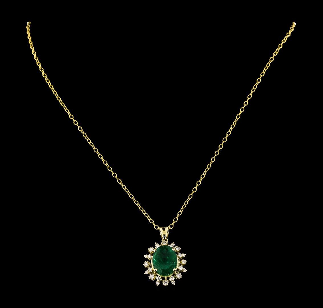 One electronically tested 14KT yellow gold lady's combination cast & assembled fashion pendant & chain 18.0' long, 1.9mm twisted oval shape link with a lobster claw clasp with a staggered double basket halo with a bright polish finish. Identified with markings of '14K'. Condition is new, good workmanship. Containing: One prong set oval modified mixed cut natural emerald, measuring 14.00 x 10.74 x 6.70mm, (depth est.) 12%. bulge factor, approximate weight of 6.40ct., clarity is heavily included, medium, moderately strong, green color, (GIA G 5/4), cut is good. Transmitting light somewhat diffusely, semi-transparent to translucent. Naturally occurring internal & external characteristics are present. Indications of oil residue. Colored gemstones are presumed to have been subjected to commonly used enhancement processes. Graded in the setting. Eight prong set round brilliant cut diamonds, measuring 2.10 - 2.05 x 1.29mm (depth est.) approximate total weight of 8 Stones = 0.27ct. Graded in the setting. Clarity SI-1 to SI-2. Color: G - H Cut Good Eight prong set round brilliant cut diamonds, measuring 1.90 - 1.80 x 1.11mm (depth est.) approximate total weight of 8 Stones = 0.18ct. Graded in the setting. Clarity VS-2 to SI-1. Color: G - H Cut Good Eight prong set round brilliant cut diamonds, measuring 1.60 - 1.55 x 0.98mm (depth est.) approximate total weight of 8 Stones = 0.12ct. Graded in the setting. Clarity SI-1 to SI-2. Color: H - I Cut Good. Total Weight of Colored Stones 6.40ct.. Total Weight of Diamonds 0.57ct.. Total Weight of Pendant & Chain 7.30gm. GAS Appraised at $8,860.00.