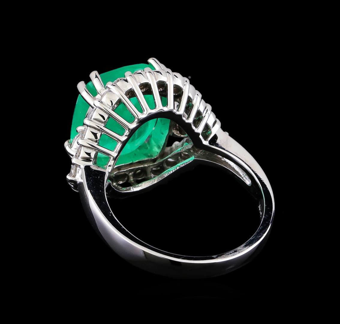 One electronically tested 14KT white gold lady's cast fashion ring with a basket halo with a bright polish finish. The featured lady's ring has a shank measuring 2.79 millimeters in width. Identified with markings of "K14". Condition is new, good workmanship. Containing: One prong set rectangular cushion modified brilliant cut natural emerald, measuring 12.65 x 10.58 x 7.25mm, (depth est.) 3%. bulge factor, approximate weight of 6.40ct., clarity is heavily included, medium, moderately strong, green color, (GIA G 5/4), cut is good. Transmitting light somewhat diffusely, transparent to translucent. Colored gemstones are presumed to have been subjected to commonly used enhancement processes. Indications of oil residue. Graded in the setting. Two prong set round brilliant cut diamonds, measuring 2.80 - 2.70 x 1.68mm (depth est.) approximate total weight of 2 Stones = 0.14ct. Graded in the setting. Clarity: SI-2. Color: G - Good Twenty-Four prong set round brilliant cut diamonds, measuring 2.10 - 2.05 x 1.25mm (depth est.) approximate total weight of 24 Stones = 0.82ct. Graded in the setting. Clarity: SI-1 to SI-2. Color: G - Good. Total Weight of Colored Stones 6.40ct. Total Weight of Diamonds 0.96ct. Total Weight of Ring 8.20gm GAS Appraised at $13,600.00.