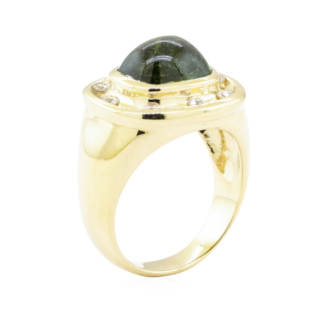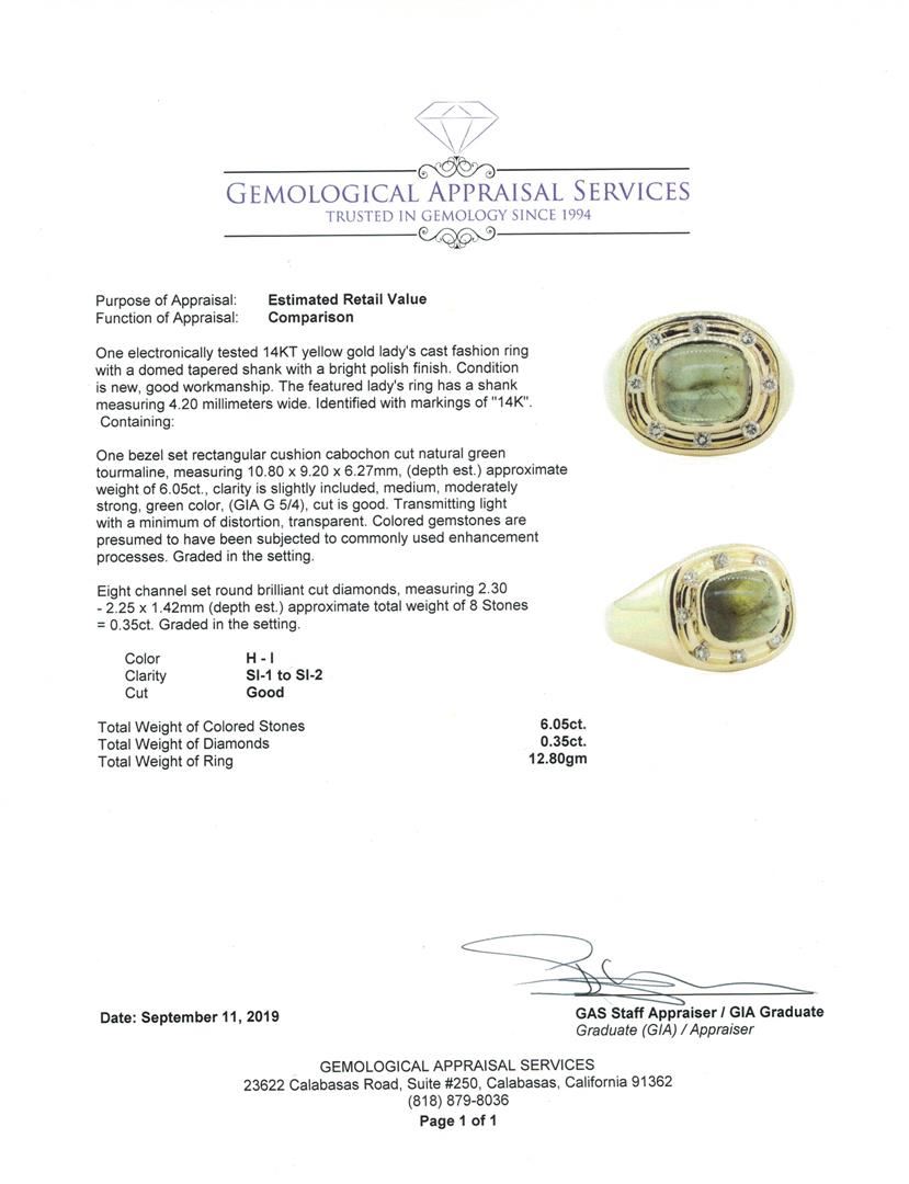 One electronically tested 14KT yellow gold lady's cast fashion ring with a domed tapered shank with a bright polish finish. The featured lady's ring has a shank measuring 4.20 millimeters wide. Identified with markings of '14K'. Condition is new, good workmanship. Containing: One bezel set rectangular cushion cabochon cut natural green tourmaline, measuring 10.80 x 9.20 x 6.27mm, (depth est.) approximate weight of 6.05ct., clarity is slightly included, medium, moderately strong, green color, (GIA G 5/4), cut is good. Transmitting light with a minimum of distortion, transparent. Colored gemstones are presumed to have been subjected to commonly used enhancement processes. Graded in the setting. Eight channel set round brilliant cut diamonds, measuring 2.30 - 2.25 x 1.42mm (depth est.) approximate total weight of 8 Stones = 0.35ct. Graded in the setting. Color H - I Clarity SI-1 to SI-2 Cut Good. Total Weight of Colored Stones 6.05ct.. Total Weight of Diamonds 0.35ct.. Total Weight of Ring 12.80gm GAS Appraised at  $4480.00. GAS Appraised at $4,480.00.
