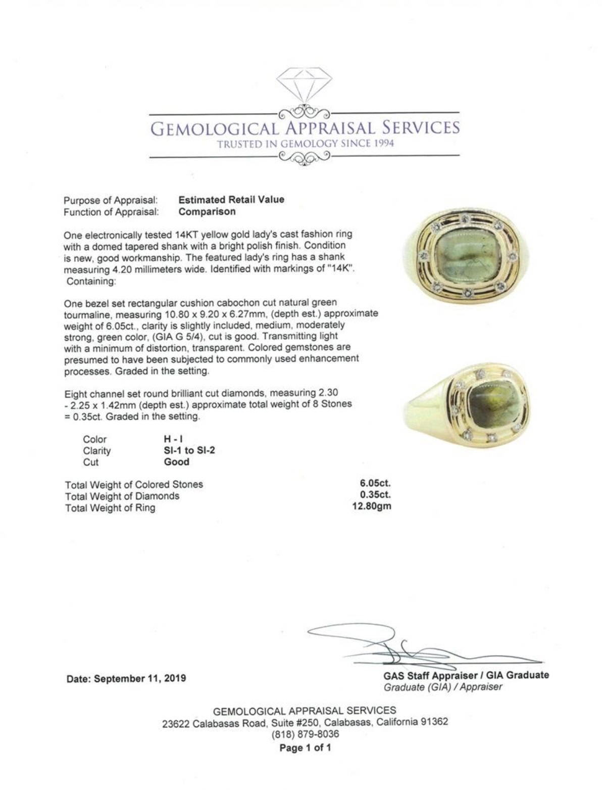 One electronically tested 14KT yellow gold lady's cast fashion ring with a domed tapered shank with a bright polish finish. The featured lady's ring has a shank measuring 4.20 millimeters wide. Identified with markings of '14K'. Condition is new, good workmanship. Containing: One bezel set rectangular cushion cabochon cut natural green tourmaline, measuring 10.80 x 9.20 x 6.27mm, (depth est.) approximate weight of 6.05ct., clarity is slightly included, medium, moderately strong, green color, (GIA G 5/4), cut is good. Transmitting light with a minimum of distortion, transparent. Colored gemstones are presumed to have been subjected to commonly used enhancement processes. Graded in the setting. Eight channel set round brilliant cut diamonds, measuring 2.30 - 2.25 x 1.42mm (depth est.) approximate total weight of 8 Stones = 0.35ct. Graded in the setting. Color H - I Clarity SI-1 to SI-2 Cut Good. Total Weight of Colored Stones 6.05ct.. Total Weight of Diamonds 0.35ct.. Total Weight of Ring 12.80gm GAS Appraised at $4480.00. GAS Appraised.