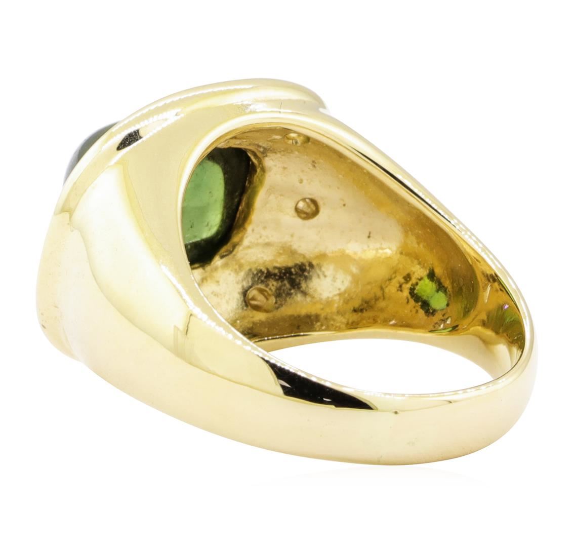 One electronically tested 14KT yellow gold lady's cast fashion ring with a domed tapered shank with a bright polish finish. The featured lady's ring has a shank measuring 4.20 millimeters wide. Identified with markings of '14K'. Condition is new, good workmanship. Containing: One bezel set rectangular cushion cabochon cut natural green tourmaline, measuring 10.80 x 9.20 x 6.27mm, (depth est.) approximate weight of 6.05ct., clarity is slightly included, medium, moderately strong, green color, (GIA G 5/4), cut is good. Transmitting light with a minimum of distortion, transparent. Colored gemstones are presumed to have been subjected to commonly used enhancement processes. Graded in the setting. Eight channel set round brilliant cut diamonds, measuring 2.30 - 2.25 x 1.42mm (depth est.) approximate total weight of 8 Stones = 0.35ct. Graded in the setting. Color H - I Clarity SI-1 to SI-2 Cut Good. Total Weight of Colored Stones 6.05ct.. Total Weight of Diamonds 0.35ct.. Total Weight of Ring 12.80gm GAS Appraised at $4480.00. GAS Appraised.