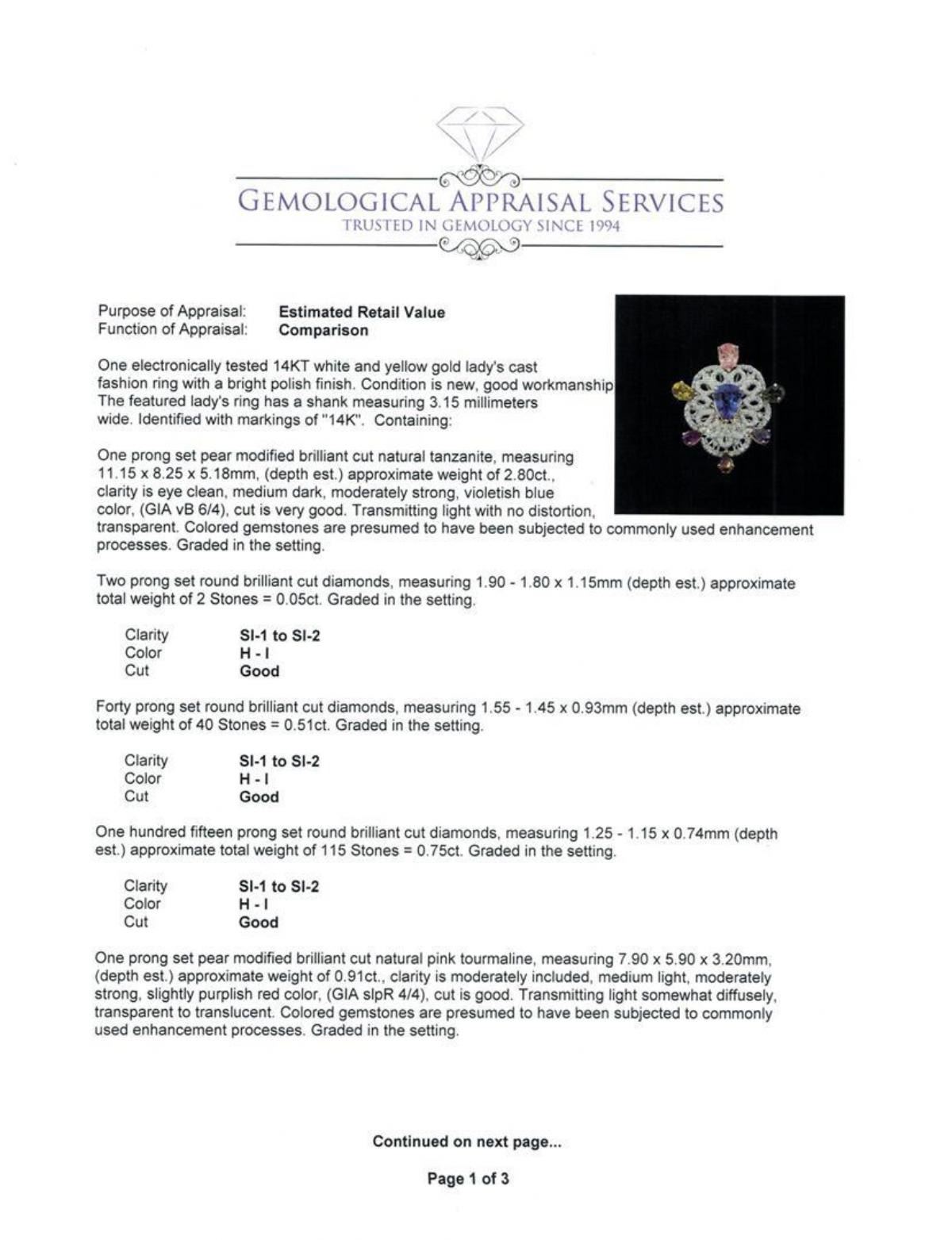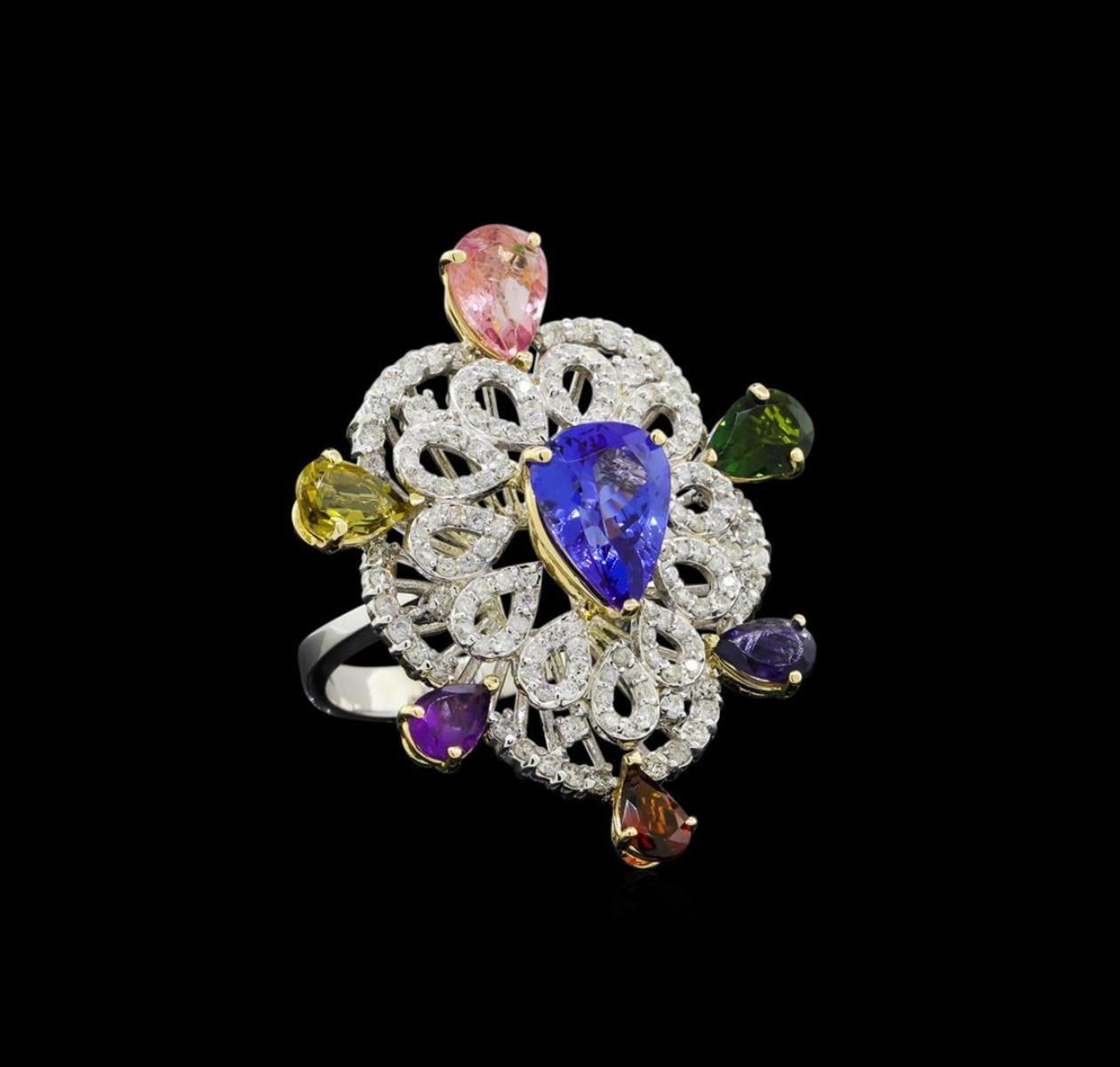 One electronically tested 14KT white and yellow gold lady's cast fashion ring with a bright polish finish. The featured lady's ring has a shank measuring 3.15 millimeters wide. Identified with markings of '14K'. Condition is new, good workmanship. Containing: One prong set pear modified brilliant cut natural tanzanite, measuring 11.15 x 8.25 x 5.18mm, (depth est.) approximate weight of 2.80ct., clarity is eye clean, medium dark, moderately strong, violetish blue color, (GIA vB 6/4), cut is very good. Transmitting light with no distortion, transparent. Colored gemstones are presumed to have been subjected to commonly used enhancement processes. Graded in the setting. Two prong set round brilliant cut diamonds, measuring 1.90 - 1.80 x 1.15mm (depth est.) approximate total weight of 2 Stones = 0.05ct. Graded in the setting. Clarity SI-1 to SI-2. Color: H - I Cut Good Forty prong set round brilliant cut diamonds, measuring 1.55 - 1.45 x 0.93mm (depth est.) approximate total weight of 40 Stones = 0.51ct. Graded in the setting. Clarity SI-1 to SI-2. Color: H - I Cut Good One Hundred Fifteen prong set round brilliant cut diamonds, measuring 1.25 - 1.15 x 0.74mm (depth est.) approximate total weight of 115 Stones = 0.75ct. Graded in the setting. Clarity SI-1 to SI-2. Color: H - I Cut Good One prong set pear modified brilliant cut natural pink tourmaline, measuring 7.90 x 5.90 x 3.20mm, (depth est.) approximate weight of 0.91ct., clarity is moderately included, medium light, moderately strong, slightly purplish red color, (GIA slpR 4/4), cut is good. Transmitting light somewhat diffusely, transparent to translucent. Colored gemstones are presumed to have been subjected to commonly used enhancement processes. Graded in the setting. Two prong set pear modified brilliant cut natural green tourmalines, measuring 7.10 x 5.05 x 3.20mm, (depth est.) approximate total weight of 1.40ct., clarity is eye clean, medium, moderately strong, green color, (GIA G 5/4), cut is good. One the featured green tourmalines has a strong yellow overtone. Transmitting light with no distortion, transparent. Colored gemstones are presumed to have been subjected to commonly used enhancement processes. Graded in the setting. One prong set pear modified brilliant cut natural blue sapphire, measuring 6.00 x 3.95 x 2.90mm, (depth est.) approximate weight of 0.55ct., clarity is moderately included, medium light, very slightly grayish, violetish blue color, (GIA vB 4/3), cut is good. Transmitting light somewhat diffusely, transparent to translucent. Colored gemstones are presumed to have been subjected to commonly used enhancement processes. Graded in the setting. One prong set pear modified brilliant cut natural pyrope garnet, measuring 6.10 x 3.90 x 2.20mm, (depth est.) approximate weight of 0.39ct., clarity is eye clean, medium dark, very slightly brownish, red color, (GIA R 6/3), cut is good. Transmitting light with no distortion, transparent. Colored gemstones are presumed to have been subjected to commonly used enhancement processes. Graded in the setting. One prong set pear modified brilliant cut natural amethyst, measuring 5.40 x 4.30 x 2.80mm, (depth est.) approximate weight of 0.35ct., clarity is slightly included, medium dark, very slightly grayish, purple color, (GIA P 6/3), cut is good. Transmitting light with a minimum of distortion, transparent. Colored gemstones are presumed to have been subjected to commonly used enhancement processes. Graded in the setting. Total Weight of Colored Stones 6.40ct.. Total Weight of Diamonds 1.31ct.. Total Weight of Ring 11.60gm. GAS Appraised.