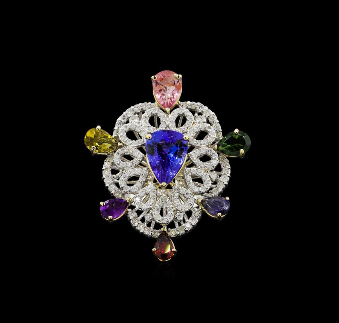 One electronically tested 14KT white and yellow gold lady's cast fashion ring with a bright polish finish. The featured lady's ring has a shank measuring 3.15 millimeters wide. Identified with markings of '14K'. Condition is new, good workmanship. Containing: One prong set pear modified brilliant cut natural tanzanite, measuring 11.15 x 8.25 x 5.18mm, (depth est.) approximate weight of 2.80 ct., clarity is eye clean, medium dark, moderately strong, violetish blue color, (GIA vB 6/4), cut is very good. Transmitting light with no distortion, transparent. Colored gemstones are presumed to have been subjected to commonly used enhancement processes. Graded in the setting. Two prong set round brilliant cut diamonds, measuring 1.90 - 1.80 x 1.15mm (depth est.) approximate total weight of 2 Stones = 0.05ct. Graded in the setting. Clarity SI-1 to SI-2. Color: H - I Cut Good Forty prong set round brilliant cut diamonds, measuring 1.55 - 1.45 x 0.93mm (depth est.) approximate total weight of 40 Stones = 0.51ct. Graded in the setting. Clarity SI-1 to SI-2. Color: H - I Cut Good One Hundred Fifteen prong set round brilliant cut diamonds, measuring 1.25 - 1.15 x 0.74mm (depth est.) approximate total weight of 115 Stones = 0.75ct. Graded in the setting. Clarity SI-1 to SI-2. Color: H - I Cut Good One prong set pear modified brilliant cut natural pink tourmaline, measuring 7.90 x 5.90 x 3.20mm, (depth est.) approximate weight of 0.91ct., clarity is moderately included, medium light, moderately strong, slightly purplish red color, (GIA slpR 4/4), cut is good. Transmitting light somewhat diffusely, transparent to translucent. Colored gemstones are presumed to have been subjected to commonly used enhancement processes. Graded in the setting. Two prong set pear modified brilliant cut natural green tourmalines, measuring 7.10 x 5.05 x 3.20mm, (depth est.) approximate total weight of 1.40 ct., clarity is eye clean, medium, moderately strong, green color, (GIA G 5/4), cut is good. One the featured green tourmalines has a strong yellow overtone. Transmitting light with no distortion, transparent. Colored gemstones are presumed to have been subjected to commonly used enhancement processes. Graded in the setting. One prong set pear modified brilliant cut natural blue sapphire, measuring 6.00 x 3.95 x 2.90mm, (depth est.) approximate weight of 0.55ct., clarity is moderately included, medium light, very slightly grayish, violetish blue color, (GIA vB 4/3), cut is good. Transmitting light somewhat diffusely, transparent to translucent. Colored gemstones are presumed to have been subjected to commonly used enhancement processes. Graded in the setting. One prong set pear modified brilliant cut natural pyrope garnet, measuring 6.10 x 3.90 x 2.20mm, (depth est.) approximate weight of 0.39ct., clarity is eye clean, medium dark, very slightly brownish, red color, (GIA R 6/3), cut is good. Transmitting light with no distortion, transparent. Colored gemstones are presumed to have been subjected to commonly used enhancement processes. Graded in the setting. One prong set pear modified brilliant cut natural amethyst, measuring 5.40 x 4.30 x 2.80mm, (depth est.) approximate weight of 0.35ct., clarity is slightly included, medium dark, very slightly grayish, purple color, (GIA P 6/3), cut is good. Transmitting light with a minimum of distortion, transparent. Colored gemstones are presumed to have been subjected to commonly used enhancement processes. Graded in the setting. Total Weight of Colored Stones 6.40 ct.. Total Weight of Diamonds 1.31ct.. Total Weight of Ring 11.60gm. GAS Appraised.