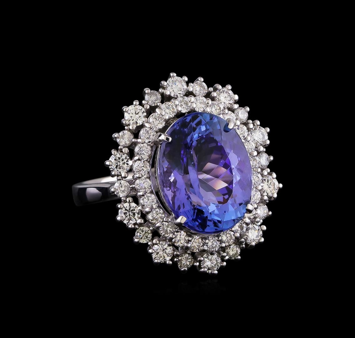 One electronically tested 14KT white gold lady's cast fashion ring with a double basket halo with a bright polish finish. The featured lady's has a shank measuring 2.60 millimeters in width. Identified with markings of "K14". Condition is new, good workmanship. Containing: One prong set oval modified brilliant cut natural tanzanite, measuring 12.98 x 9.97 x 7.17mm, (depth est.) approximate weight of 6.40ct., clarity is eye clean, medium light, very slightly grayish, violetish blue color, (GIA vB 4/3), cut is very good. Transmitting light with no distortion, transparent. Colored gemstones are presumed to have been subjected to commonly used enhancement processes. Graded in the setting. Ten prong set round brilliant cut diamonds, measuring 2.40 - 2.30 x 1.45mm (depth est.) approximate total weight of 10 Stones = 0.48ct. Graded in the setting. Clarity: VS-2 to SI-2. Color: H - I. Cut Good Thirty-Four prong set round brilliant cut diamonds, measuring 1.80 - 1.75 x 1.10mm (depth est.) approximate total weight of 34 Stones = 0.73ct. Graded in the setting. Clarity: SI-1 to SI-2. Color: H - I. Cut Good. Total Weight of Colored Stones 6.40ct. Total Weight of Diamonds 1.21ct. Total Weight of Ring 7.20gm. GAS Appraised.
