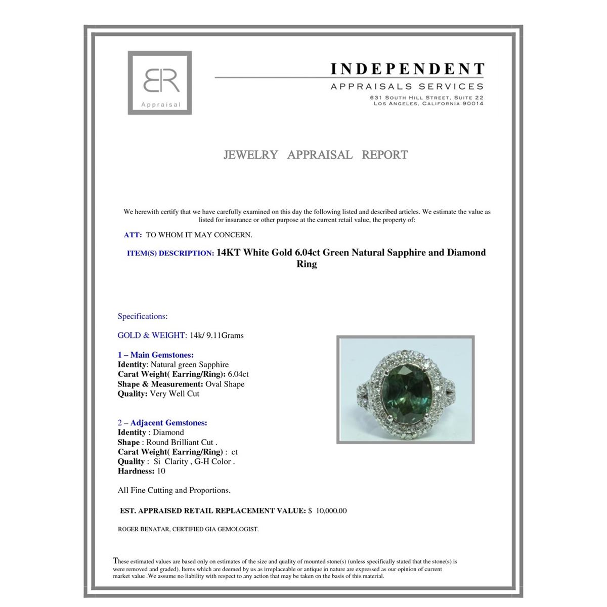 14K W/G NATURAL CEYLON GREEN SAPPHIRE RING :9.11GM /NATURAL SAPPHIRE /DIA :1.20CT/GREEN SAPPHIRE :6.04CT/#GVR1370