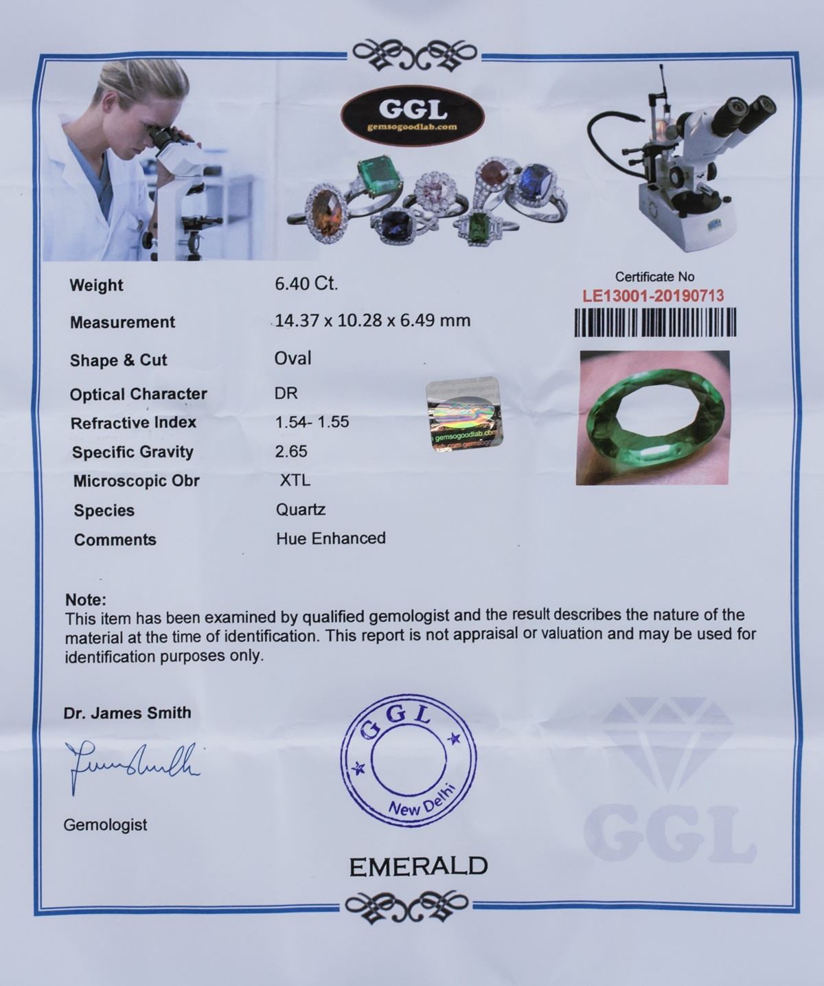 6.40ct green emerald gemstone. Oval cut. With GGL certificate. 14.37 x 10.28 x 6.49 mm