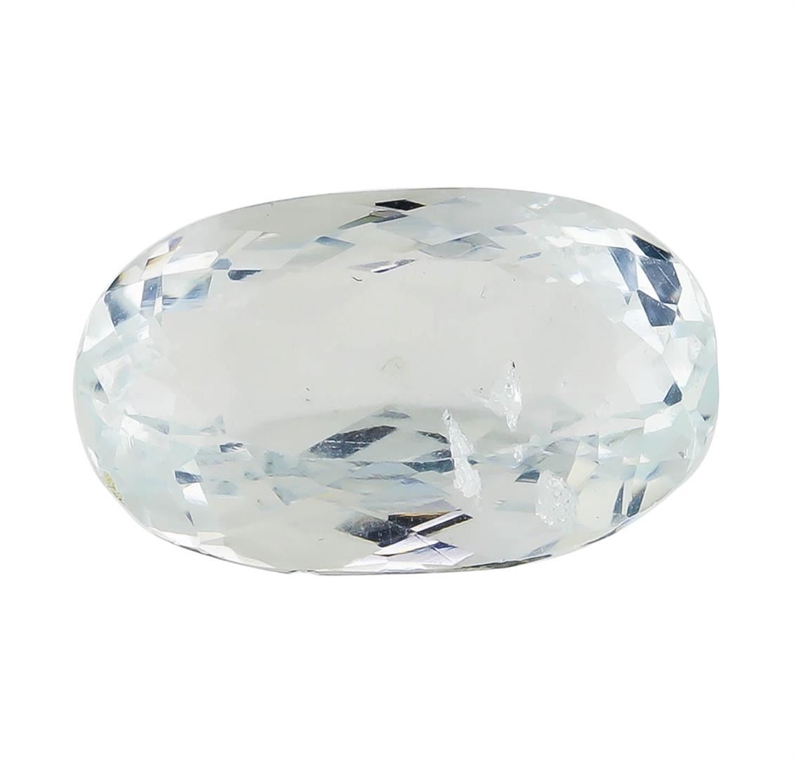 One natural oval cut aquamarine with an exact weight of 6.41ct., clarity is slightly included, slightly grayish greenish blue. Gemological Appraisals Services estimates the retail value at $2243.5 GAS Appraised.