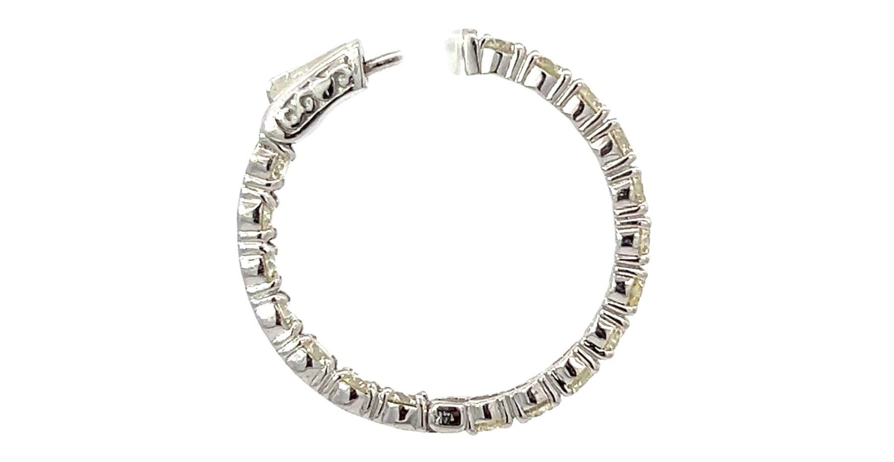 One pair electronically tested 14KT white gold lady's combination cast & assembled fashion inside-out hoop earrings with a bright polish finish. The featured hoop earring has a diameter of 30 millimeter. Identified with markings of "14K". Condition is new, good workmanship. Containing: Thirty-Six prong set round brilliant cut diamonds, measuring 3.60 - 3.50 x 2.29mm (depth est.) approximate total weight of 36 Stones = 6.41ct. Graded in the setting. Color I - J Clarity VS-2 to SI-1 Cut Very Good Total Weight of Diamonds 6.41ct. Total Weight of Earrings 9.90gm Estimated Retail Value $ 22400.00