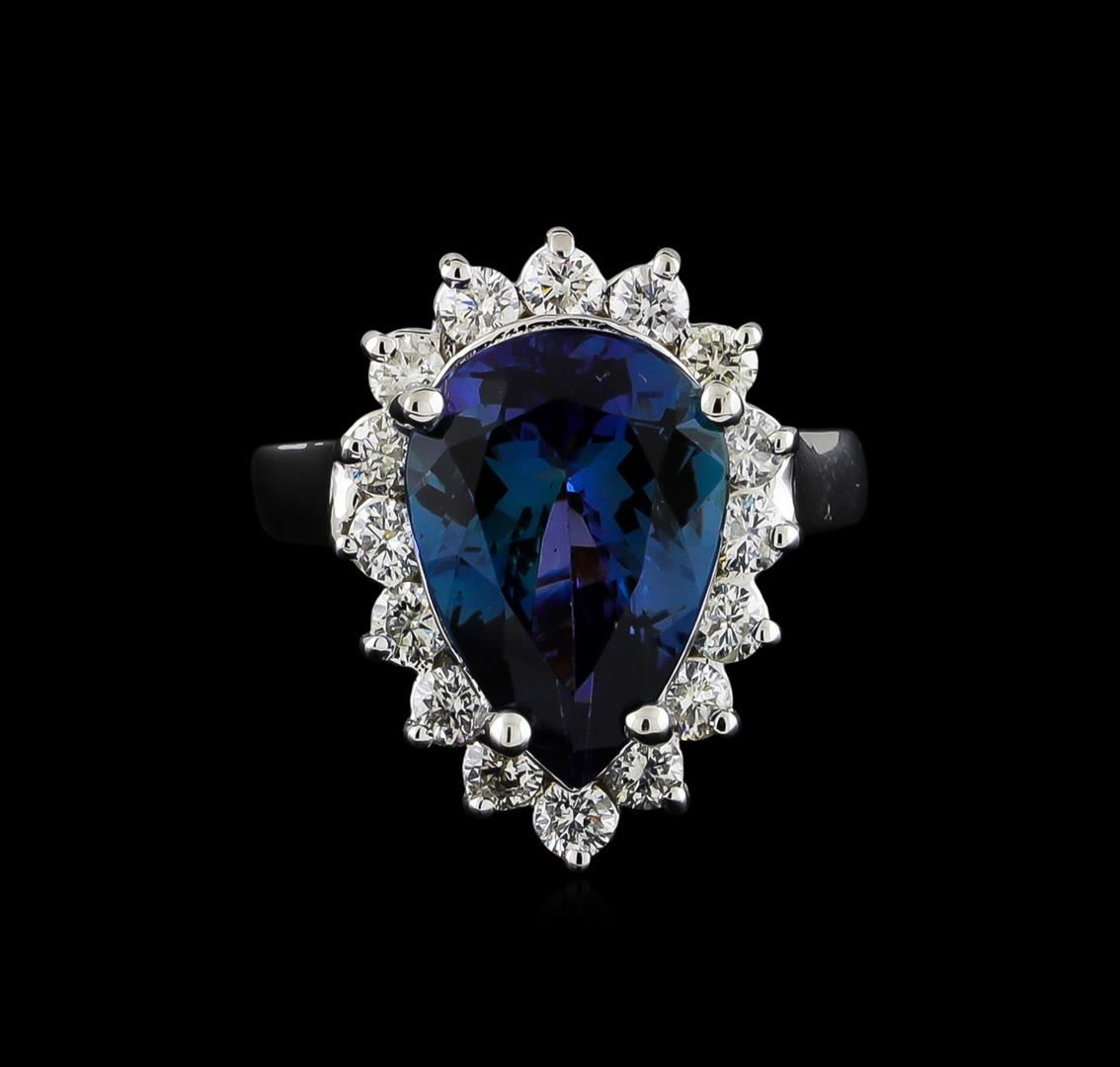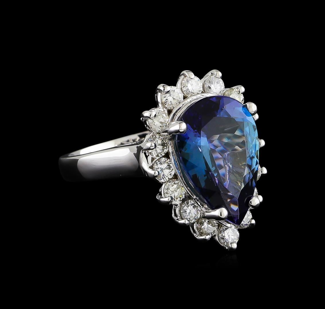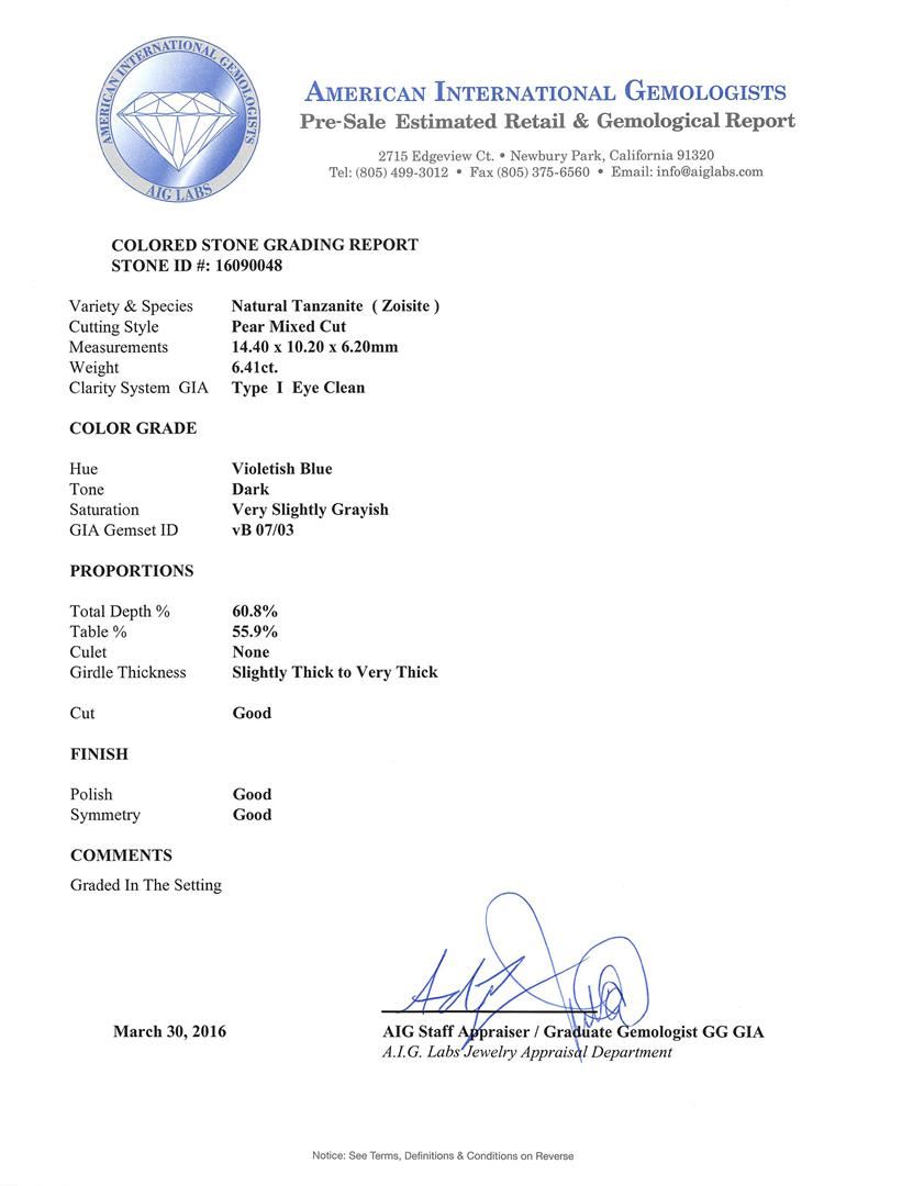 One electronically tested 14KT white gold ladies cast tanzanite and diamond ring with a bright polish finish. The featured tanzanite is set within a diamond floret supported by a ribbed under gallery, completed by a two millimeter wide band. Identified with markings of "14K". Condition is new, good workmanship. Containing: One prong set pear mixed cut natural tanzanite, measuring 14.40 x 10.20 x 6.20mm, 5%. bulge factor, approximate weight of 6.41ct., clarity is eye clean, type I, dark, very slightly grayish, violetish blue color, (GIA vB 7/3), cut is good. Transmitting light with no distortion, transparent. Colored Stone Grading Report attached. Graded in the setting. Tanzanite is a very rare gemstone that is only found in the country of Tanzania. Originally discovered in 1967. Tiffany & Company, named the stone Tanzanite. It is found in the Usumburu Mountains that border the Umba Valley of northern Tanzania. Tanzanite occurs in gray, brown, violet, blue, reddish-purple, & green. The gem is interesting because of its exceptional pleochroism. Rotated in different directions a tanzanite will exhibit multiple changes of color. Tanzanite has a low tolerance to ultrasonic cleaning, and should not be cleaned using this method. Sixteen prong set round brilliant cut diamonds, measuring 2.50 - 2.50 x 1.50mm (depth est.) approximate. Total Weight of 16 Stones = 0.95ct. Graded in the setting. Clarity: SI-2 to I-2. Color: F - H. Total Weight of Colored Stones 6.41ct. Total Weight of Diamonds 0.95ct. Total Weight of Ring 7.27gm. AIG Appraised at $17,665.00.