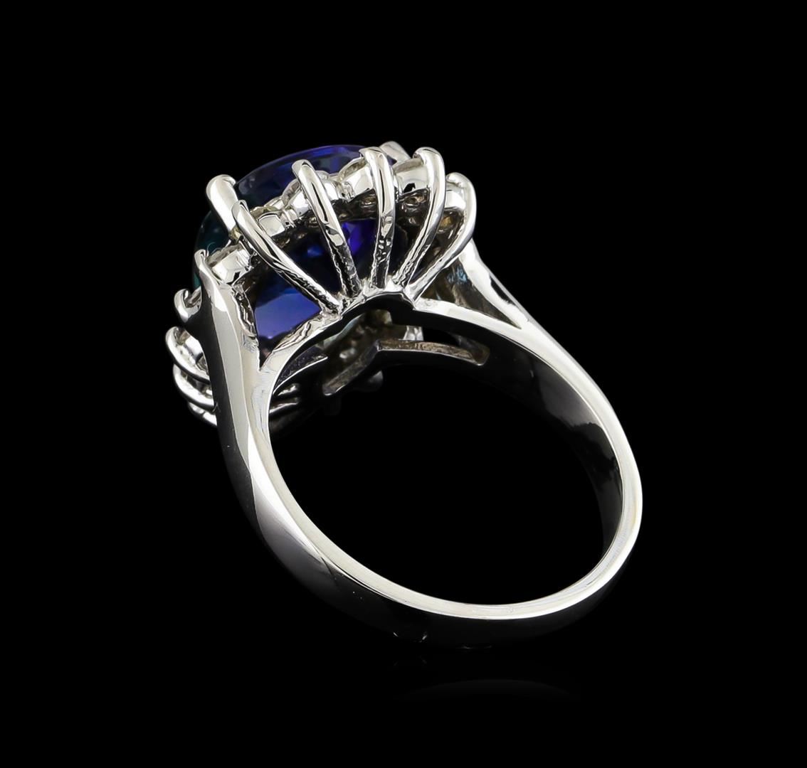 One electronically tested 14KT white gold ladies cast tanzanite and diamond ring with a bright polish finish. The featured tanzanite is set within a diamond floret supported by a ribbed under gallery, completed by a two millimeter wide band. Identified with markings of "14K". Condition is new, good workmanship. Containing: One prong set pear mixed cut natural tanzanite, measuring 14.40 x 10.20 x 6.20mm, 5%. bulge factor, approximate weight of 6.41ct., clarity is eye clean, type I, dark, very slightly grayish, violetish blue color, (GIA vB 7/3), cut is good. Transmitting light with no distortion, transparent. Colored Stone Grading Report attached. Graded in the setting. Tanzanite is a very rare gemstone that is only found in the country of Tanzania. Originally discovered in 1967. Tiffany & Company, named the stone Tanzanite. It is found in the Usumburu Mountains that border the Umba Valley of northern Tanzania. Tanzanite occurs in gray, brown, violet, blue, reddish-purple, & green. The gem is interesting because of its exceptional pleochroism. Rotated in different directions a tanzanite will exhibit multiple changes of color. Tanzanite has a low tolerance to ultrasonic cleaning, and should not be cleaned using this method. Sixteen prong set round brilliant cut diamonds, measuring 2.50 - 2.50 x 1.50mm (depth est.) approximate. Total Weight of 16 Stones = 0.95ct. Graded in the setting. Clarity: SI-2 to I-2. Color: F - H. Total Weight of Colored Stones 6.41ct. Total Weight of Diamonds 0.95ct. Total Weight of Ring 7.27gm. AIG Appraised at $17,665.00.