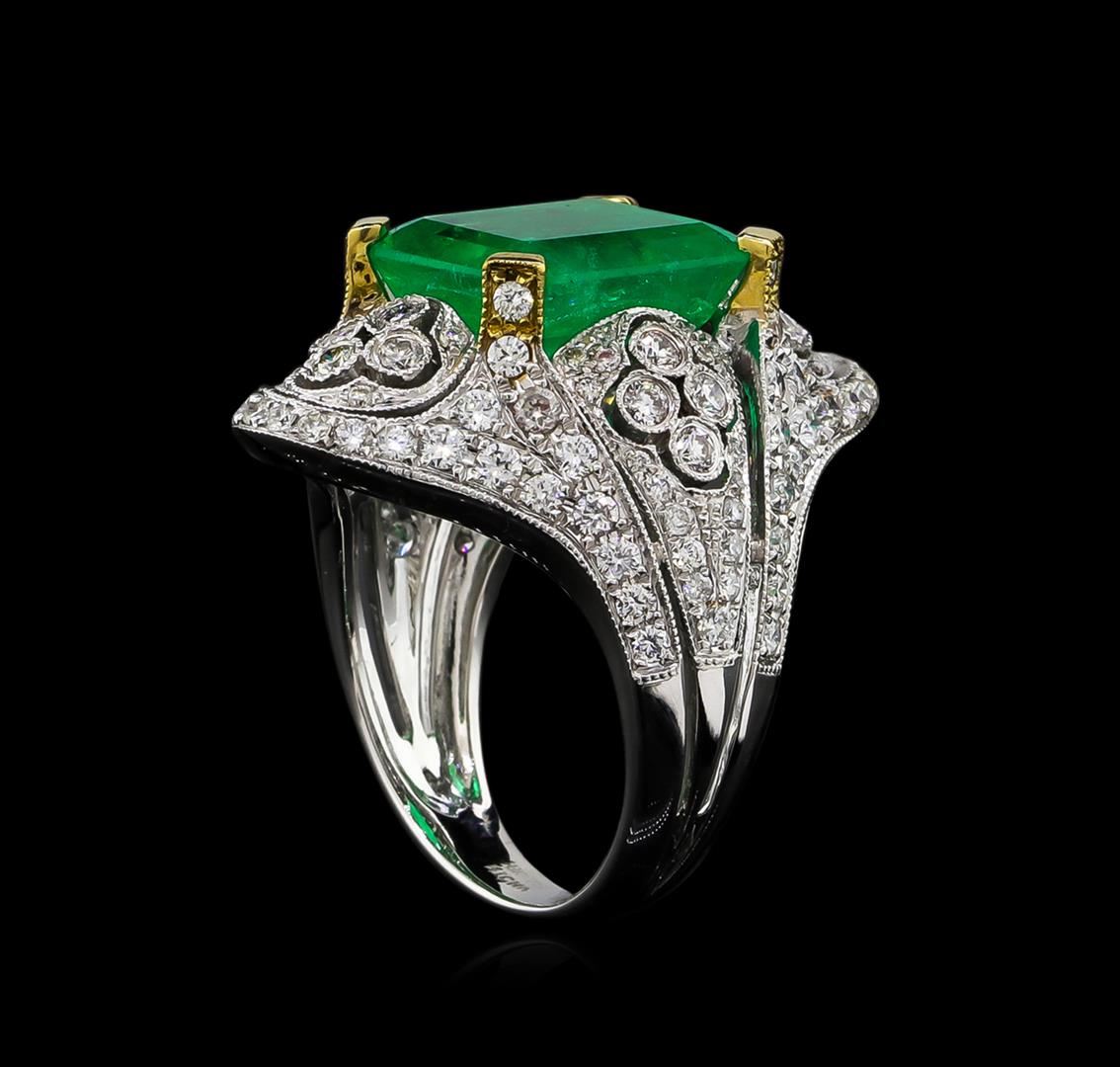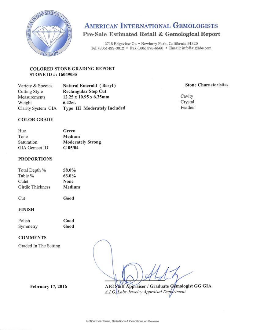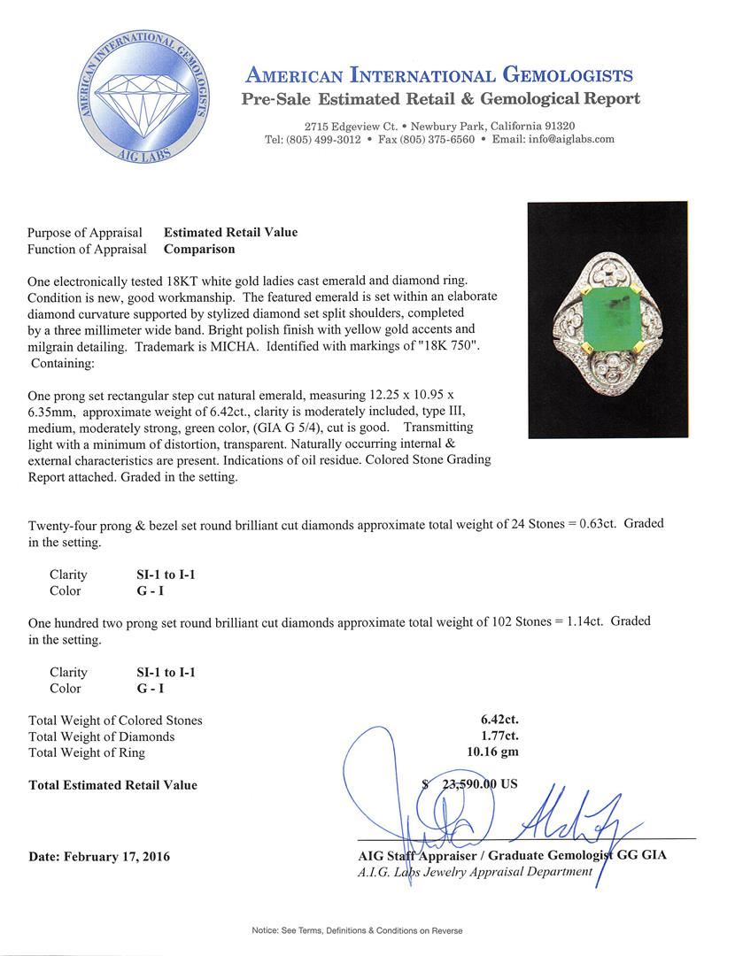 One electronically tested 18KT white gold ladies cast emerald and diamond ring. The featured emerald is set within an elaborate diamond curvature supported by stylized diamond set split shoulders, completed by a three millimeter wide band. Bright polish finish with yellow gold accents and milgrain detailing. Trademark is MICHA. Identified with markings of "18K 750". Condition is new, good workmanship. Containing: One prong set rectangular step cut natural emerald, measuring 12.25 x 10.95 x 6.35mm, approximate weight of 6.42ct., clarity is moderately included, type III, medium, moderately strong, green color, (GIA G 5/4), cut is good. Transmitting light with a minimum of distortion, transparent. Naturally occurring internal & external characteristics are present. Indications of oil residue. Colored Stone Grading Report attached. Graded in the setting. Twenty-Four prong & bezel set round brilliant cut diamonds approximate total weight of 24 Stones = 0.63ct. Graded in the setting. Clarity: SI-1 to I-1. Color: G - I One Hundred Two prong set round brilliant cut diamonds approximate total weight of 102 Stones = 1.14ct. Graded in the setting. Clarity: SI-1 to I-1. Color: G - I. Total Weight of Colored Stones 6.42ct. Total Weight of Diamonds 1.77ct. Total Weight of Ring 10.16gm. AIG Appraised at $23,590.00.