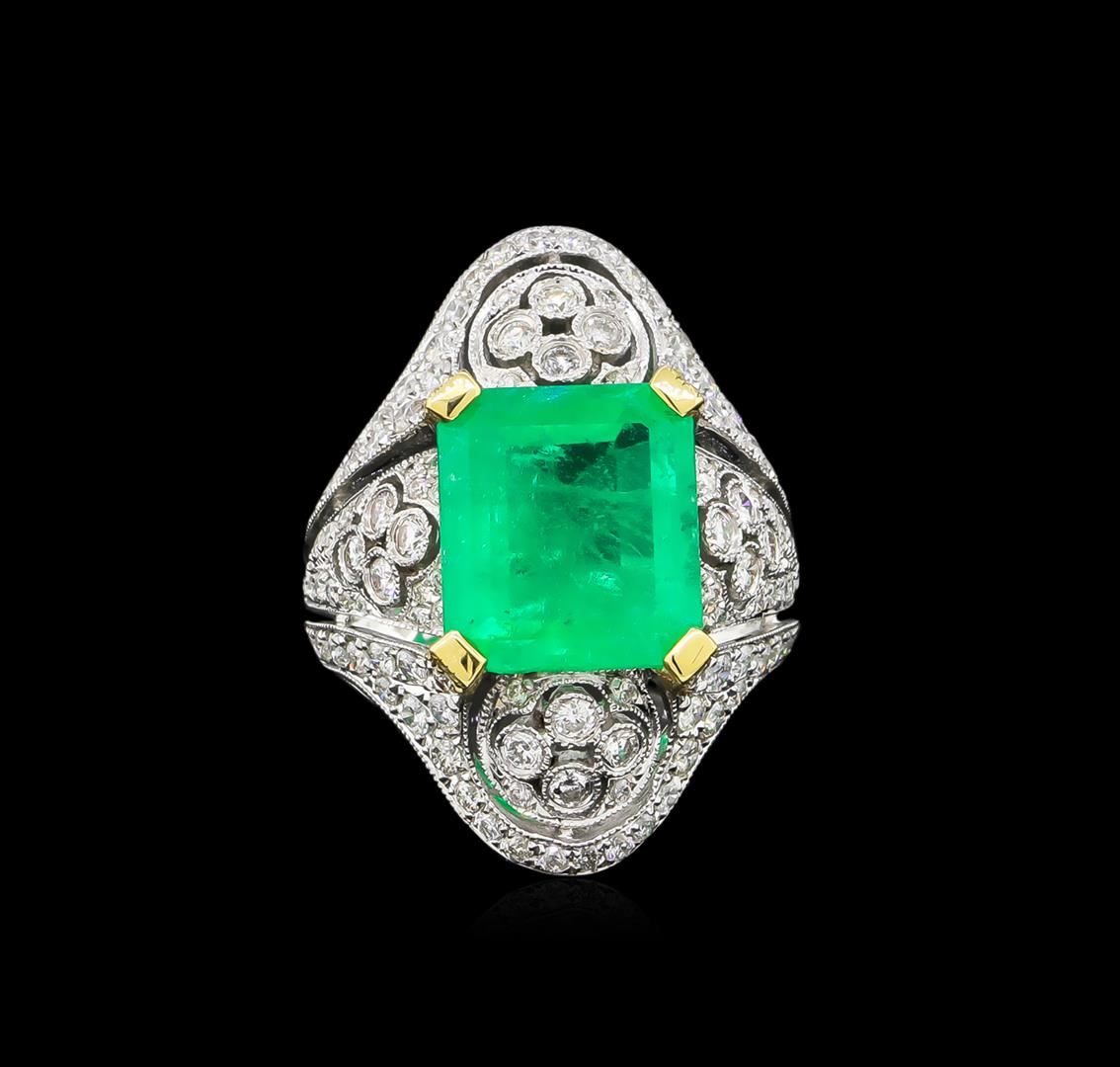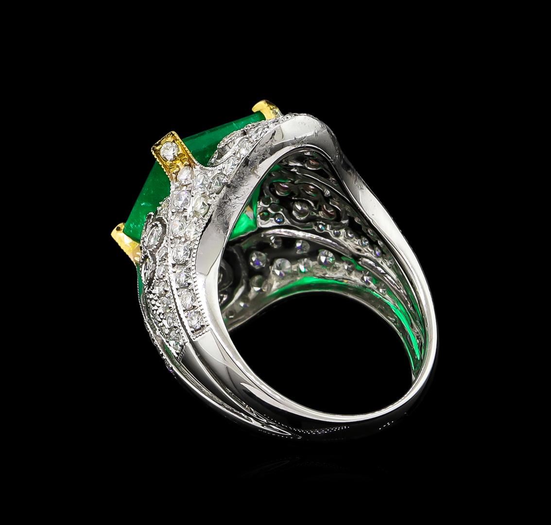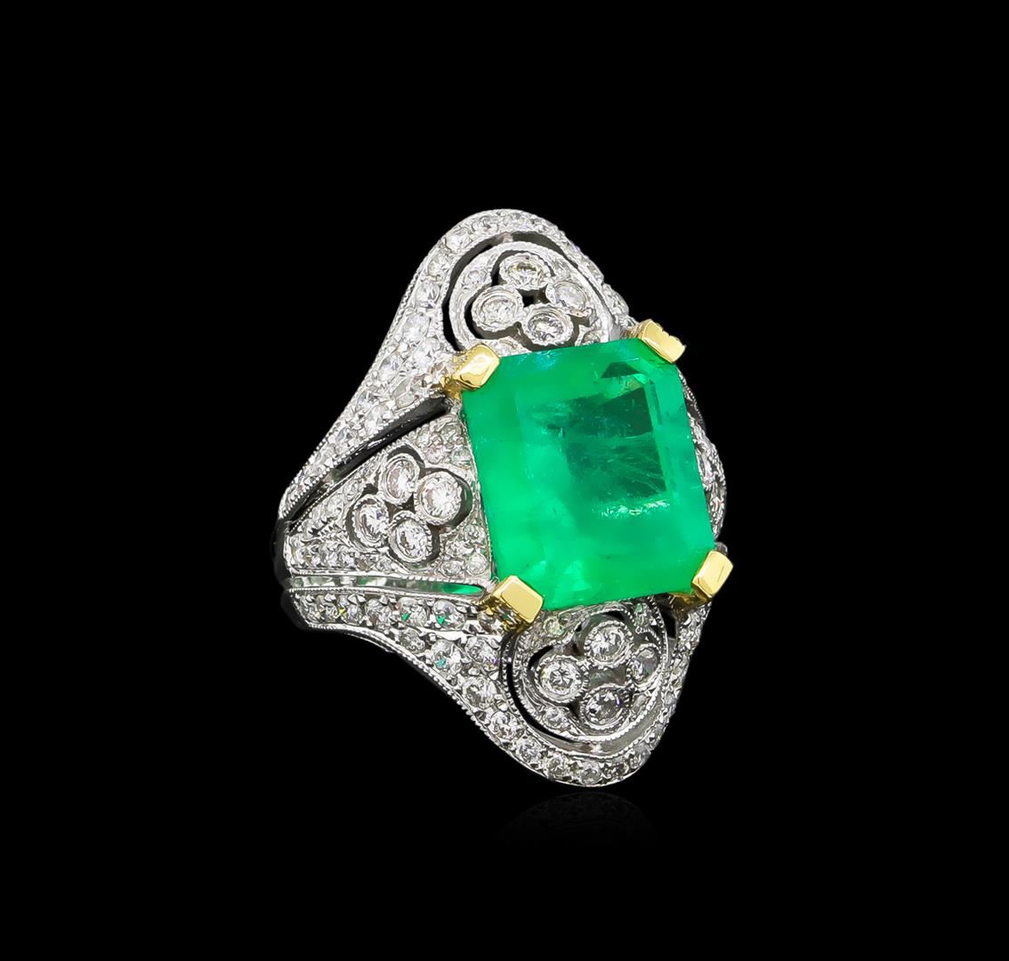 One electronically tested 18KT white gold ladies cast emerald and diamond ring. The featured emerald is set within an elaborate diamond curvature supported by stylized diamond set split shoulders, completed by a three millimeter wide band. Bright polish finish with yellow gold accents and milgrain detailing. Trademark is MICHA. Identified with markings of "18K 750". Condition is new, good workmanship. Containing: One prong set rectangular step cut natural emerald, measuring 12.25 x 10.95 x 6.35mm, approximate weight of 6.42ct., clarity is moderately included, type III, medium, moderately strong, green color, (GIA G 5/4), cut is good. Transmitting light with a minimum of distortion, transparent. Naturally occurring internal & external characteristics are present. Indications of oil residue. Colored Stone Grading Report attached. Graded in the setting. Twenty-Four prong & bezel set round brilliant cut diamonds approximate total weight of 24 Stones = 0.63ct. Graded in the setting. Clarity: SI-1 to I-1. Color: G - I One Hundred Two prong set round brilliant cut diamonds approximate total weight of 102 Stones = 1.14ct. Graded in the setting. Clarity: SI-1 to I-1. Color: G - I. Total Weight of Colored Stones 6.42ct. Total Weight of Diamonds 1.77ct. Total Weight of Ring 10.16gm. AIG Appraised at $23,590.00.