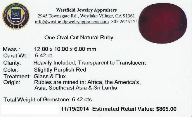 6.42ctw. One Oval Cut Natural Ruby. Westfield Appraised at $865.00.