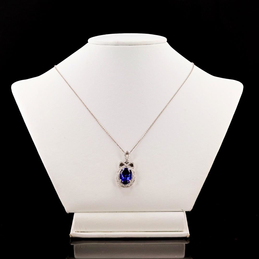 Platinum (PLAT) natural tanzanite zoisite and diamond pendant with gold chain. An oval brilliant cut natural tanzanite zoisite gemstone is mounted in the center of the pendant. Round brilliant cut diamonds accent the pendant around and on both sides of the center gemstone. The pendant and gold chain have a gross weight of 10.5 Grams. #NATURAL GEMSTONE# GEMSTONE: Tanzanite Zoisite NATURE: Natural SHAPE: Oval Brilliant, Faceted Cut WEIGHT: 6.44 carat total DIMENSIONS: 13.68 x 9.04 x 7.15mm CLARITY: Type 1 COLOR: Bluish Violet (5/5) SYMMETRY: Excellent COLOR INTENSITY: Intense TRANSPARENCY: Transparent TONE: Dark #NATURAL DIAMOND# SHAPE: Round Brilliant Cut WEIGHT: 0.66 carat total (93pcs.) DIMENSIONS: 1.3 x 1.0mm AVERAGE CLARITY: VS2-SI1 AVERAGE COLOR: F-G SYMMETRY: Excellent POLISH: Excellent #METAL# METAL: Platinum PURITY: 950 COLOR: White CONDITION: Excellent FINISH: High Polish