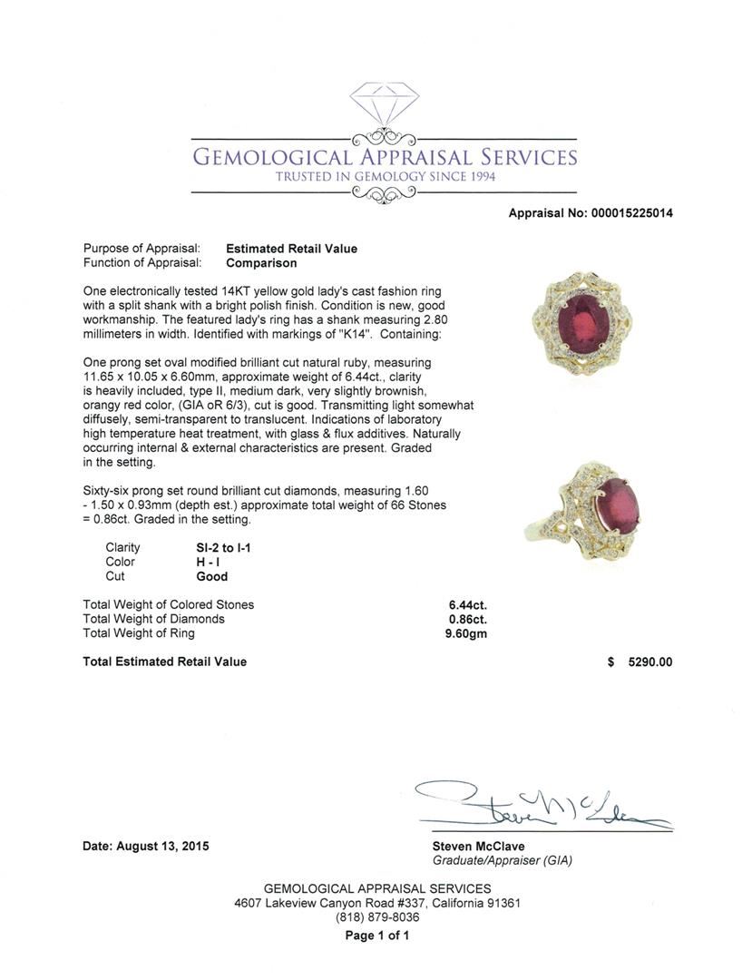 One electronically tested 14KT yellow gold lady's cast fashion ring with a split shank with a bright polish finish. The featured lady's ring has a shank measuring 2.80 millimeters in width. Identified with markings of "K14". Condition is new, good workmanship. Containing: One prong set oval modified brilliant cut natural ruby, measuring 11.65 x 10.05 x 6.60mm, approximate weight of 6.44ct., clarity is heavily included, type II, medium dark, very slightly brownish, orangy red color, (GIA oR 6/3), cut is good. Transmitting light somewhat diffusely, semi-transparent to translucent. Indications of laboratory high temperature heat treatment, with glass & flux additives. Naturally occurring internal & external characteristics are present. Graded in the setting. Sixty-Six prong set round brilliant cut diamonds, measuring 1.60 - 1.50 x 0.93mm (depth est.) approximate total weight of 66 Stones = 0.86ct. Graded in the setting. Clarity: SI-2 to I-1. Color: H - I. Cut Good. Total Weight of Colored Stones 6.44ct. Total Weight of Diamonds 0.86ct. Total Weight of Ring 9.60gm. GAS Appraised at $5,290.00.