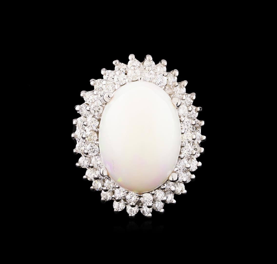 One electronically tested 14KT white gold lady's cast fashion ring with a double basket halo with a bright polish finish. The featured lady's ring has a shank measuring 3.58 millimeters wide. Identified with markings of "14K". Condition is new, good workmanship. Containing: One white opal that is cut in a oval shaped cabochon and is prong set, measuring 16.49 mm long x 12.30 mm wide, and 8.59 mm thick and the approximate weight is 6.45 carats. The opal has a somewhat bright, blue-green play of color (fire) in a broad flashfire pattern; a high dome; a good cut; badly included; consistent in its brightness and pattern; and is not directional. Graded in the setting. Fifty-Six prong set round brilliant cut diamonds, measuring 1.90 - 1.80 x 1.15mm (depth est.) approximate total weight of 56 Stones = 1.35ct. Graded in the setting. Clarity: SI-1 to SI-2. Color: H - I. Cut Good. Total Weight of Diamonds 1.35ct. Total Weight of Opals 6.45ct. Total Weight of Ring 8.60gm. GAS Appraised at $5,100.00.