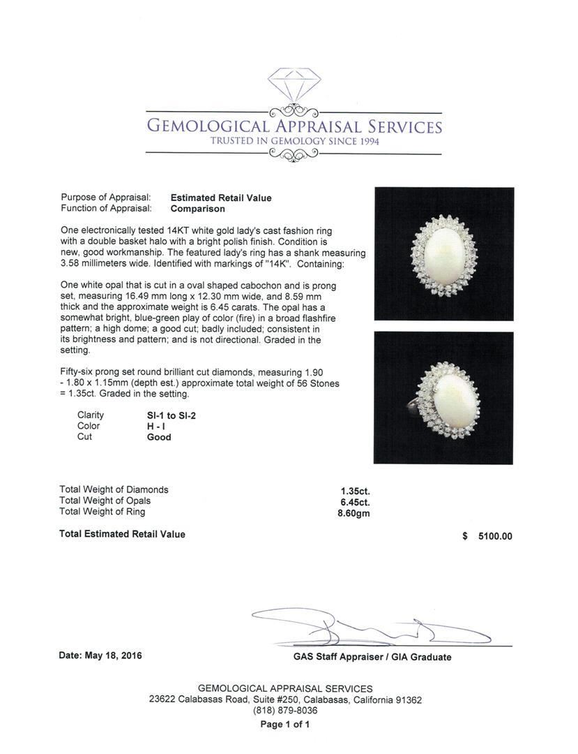 One electronically tested 14KT white gold lady's cast fashion ring with a double basket halo with a bright polish finish. The featured lady's ring has a shank measuring 3.58 millimeters wide. Identified with markings of "14K". Condition is new, good workmanship. Containing: One white opal that is cut in a oval shaped cabochon and is prong set, measuring 16.49 mm long x 12.30 mm wide, and 8.59 mm thick and the approximate weight is 6.45 carats. The opal has a somewhat bright, blue-green play of color (fire) in a broad flashfire pattern; a high dome; a good cut; badly included; consistent in its brightness and pattern; and is not directional. Graded in the setting. Fifty-Six prong set round brilliant cut diamonds, measuring 1.90 - 1.80 x 1.15mm (depth est.) approximate total weight of 56 Stones = 1.35ct. Graded in the setting. Clarity: SI-1 to SI-2. Color: H - I. Cut Good. Total Weight of Diamonds 1.35ct. Total Weight of Opals 6.45ct. Total Weight of Ring 8.60gm. GAS Appraised.