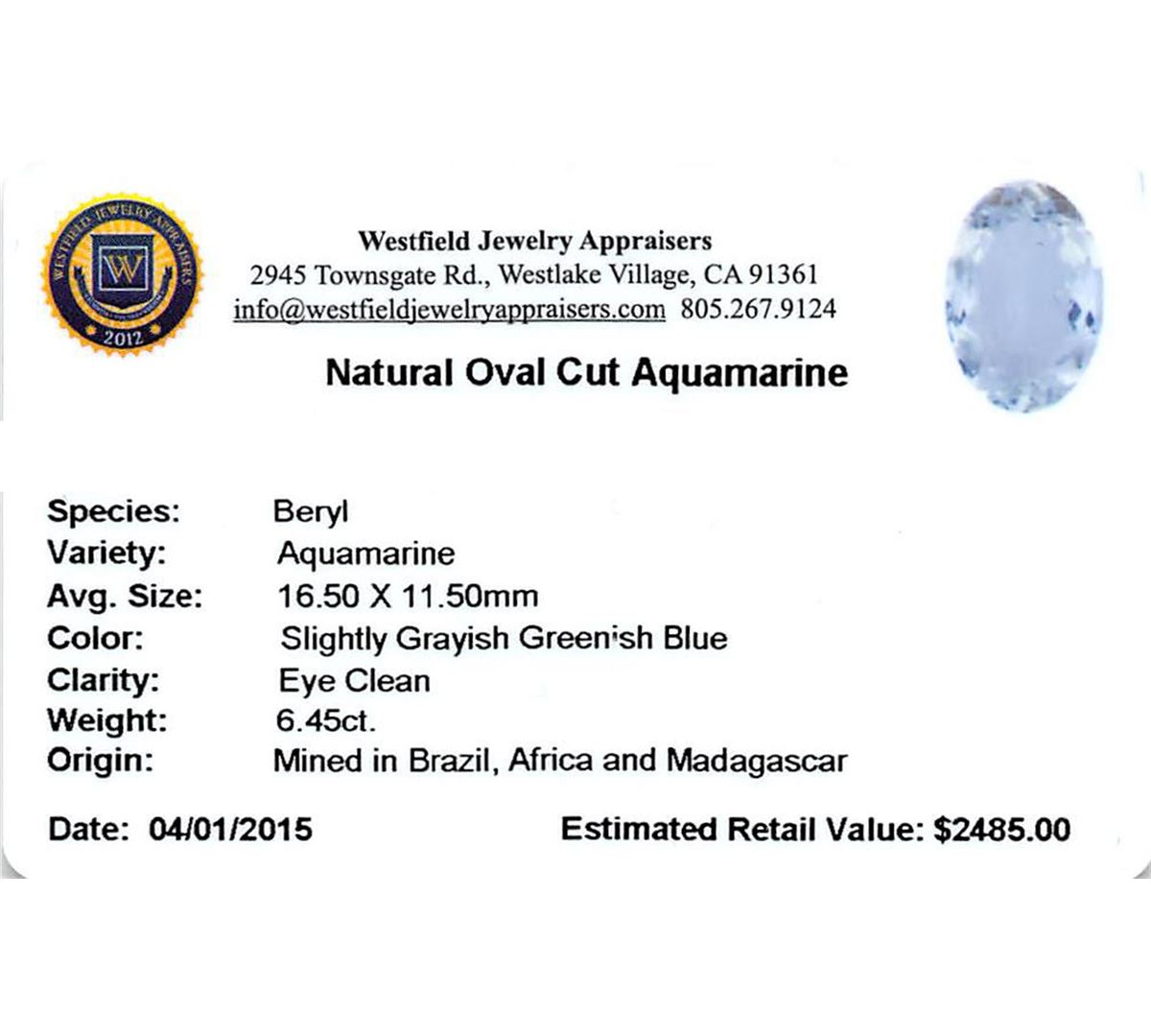 One oval cut natural aquamarine exact weight 6.45ct., clarity is eye clean, type I, medium, very slightly grayish, very slightly greenish blue color, (GIA vslgB 5/3), cut is good. Westfield Appraised at $2,485.00.