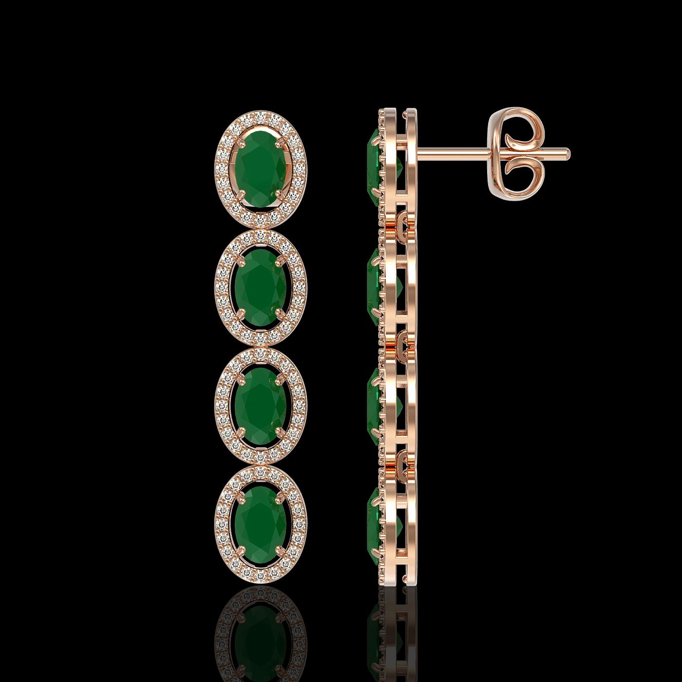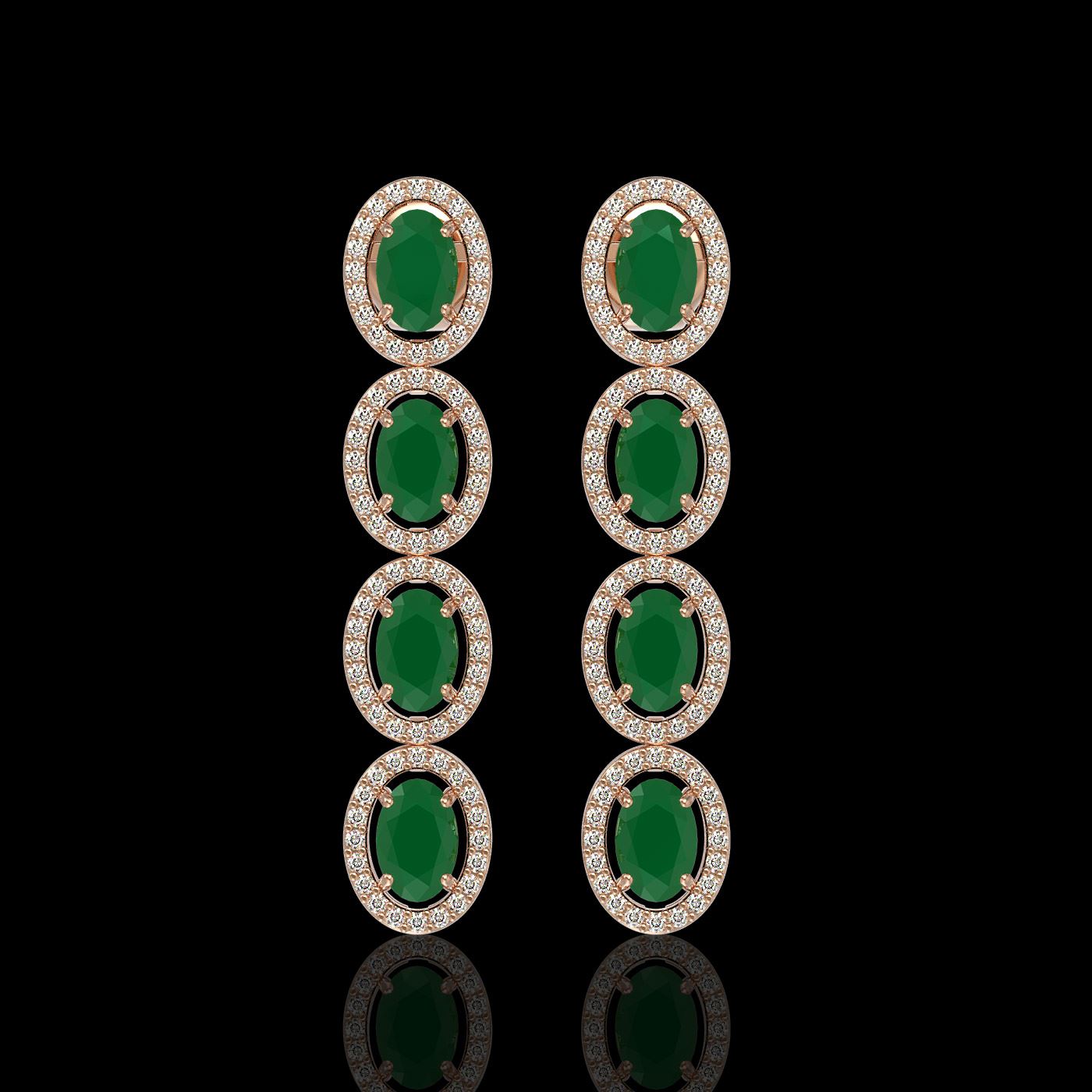 REF-114W2F -40503 ---- 6.47 CTW Emerald & Diamond Halo Earrings 10K Rose Gold ---- Luxury Designer Brand Earring Appraised at $6,300 Certificate Number US40503 10k Rose gold, Earring Size is 1 1/2 Inches Long, Earring measuring approx. 8 mm x 1 1/2 Inches, weighing in total approx. 6 grams. Made in the USA and is stamped 10k, Main stone 5.23 carat total weight containing 8 pieces of Intense Medium Green color with AAA quality Oval shape cut Emerald , Stone #2 1.24 carat total weight containing 160 pieces of G-H color with VS/SI quality Round shape cut Diamond