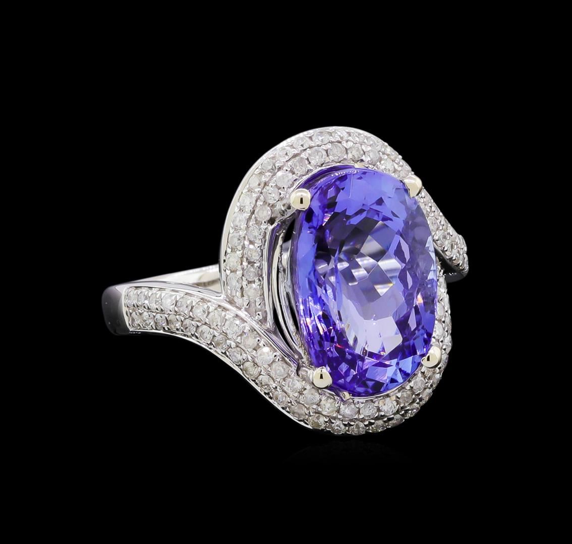 One electronically tested 14KT white gold ladies cast tanzanite and diamond ring with a bright polish finish. The featured tanzanite is set within a stylized diamond by-pass design supported by diamond set shoulders, completed by a two and one-half millimeter wide band. Trademark is Orianne. Identified with markings of "14K". Condition is new, good workmanship. Containing: One prong set oval mixed cut natural tanzanite, measuring 13.40 x 9.05 x 7.15mm, 6%. bulge factor, approximate weight of 6.47ct., clarity is eye clean, type I, medium dark, very slightly grayish, bluish violet color, (GIA bV 6/3), cut is good. Transmitting light with no distortion, transparent. Colored Stone Grading Report attached. Graded in the setting. Tanzanite is a very rare gemstone that is only found in the country of Tanzania. Originally discovered in 1967. Tiffany & Company, named the stone Tanzanite. It is found in the Usumburu Mountains that border the Umba Valley of northern Tanzania. Tanzanite occurs in gray, brown, violet, blue, reddish-purple, & green. The gem is interesting because of its exceptional pleochroism. Rotated in different directions a tanzanite will exhibit multiple changes of color. Tanzanite has a low tolerance to ultrasonic cleaning, and should not be cleaned using this method. One Hundred Two prong set round brilliant cut diamonds, measuring 1.10 - 1.00 x 0.63mm (depth est.) approximate total weight of 102 Stones = 0.52ct. Graded in the setting. Clarity: I-2 to I-3. Color: H - J. Total Weight of Colored Stones 6.47ct. Total Weight of Diamonds 0.52ct. Total Weight of Ring 7.23gm. AIG Appraised at $16,735.00.