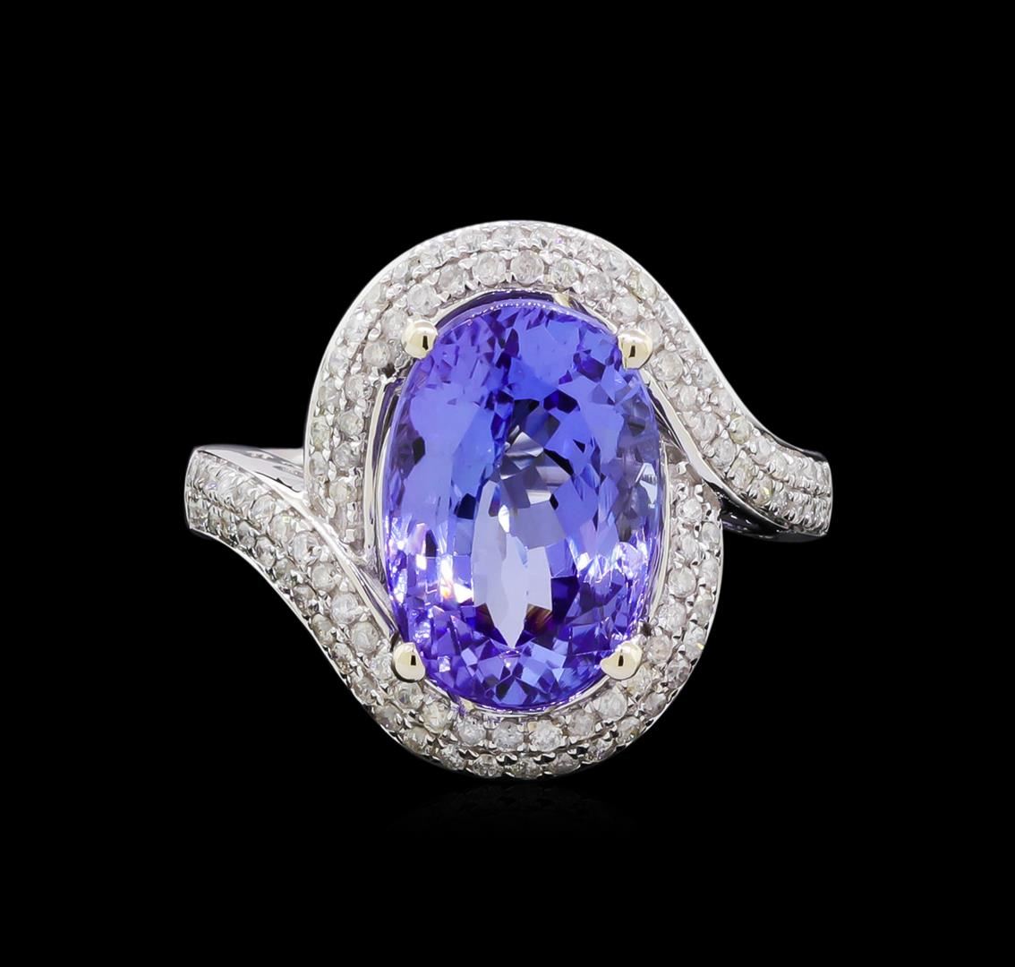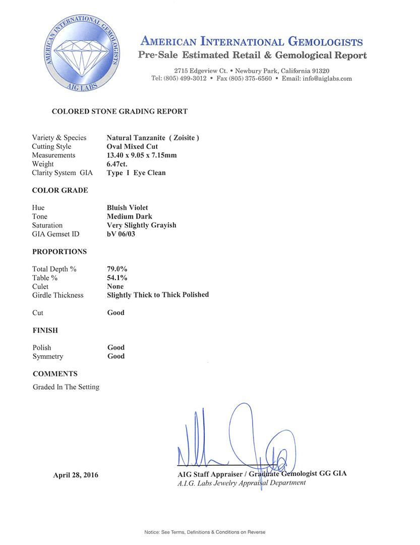 One electronically tested 14KT white gold ladies cast tanzanite and diamond ring with a bright polish finish. The featured tanzanite is set within a stylized diamond by-pass design supported by diamond set shoulders, completed by a two and one-half millimeter wide band. Trademark is Orianne. Identified with markings of "14K". Condition is new, good workmanship. Containing: One prong set oval mixed cut natural tanzanite, measuring 13.40 x 9.05 x 7.15mm, 6%. bulge factor, approximate weight of 6.47ct., clarity is eye clean, type I, medium dark, very slightly grayish, bluish violet color, (GIA bV 6/3), cut is good. Transmitting light with no distortion, transparent. Colored Stone Grading Report attached. Graded in the setting. Tanzanite is a very rare gemstone that is only found in the country of Tanzania. Originally discovered in 1967. Tiffany & Company, named the stone Tanzanite. It is found in the Usumburu Mountains that border the Umba Valley of northern Tanzania. Tanzanite occurs in gray, brown, violet, blue, reddish-purple, & green. The gem is interesting because of its exceptional pleochroism. Rotated in different directions a tanzanite will exhibit multiple changes of color. Tanzanite has a low tolerance to ultrasonic cleaning, and should not be cleaned using this method. One Hundred Two prong set round brilliant cut diamonds, measuring 1.10 - 1.00 x 0.63mm (depth est.) approximate total weight of 102 Stones = 0.52ct. Graded in the setting. Clarity: I-2 to I-3. Color: H - J. Total Weight of Colored Stones 6.47ct. Total Weight of Diamonds 0.52ct. Total Weight of Ring 7.23gm. AIG Appraised at $16,735.00.