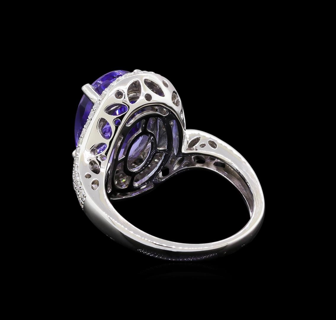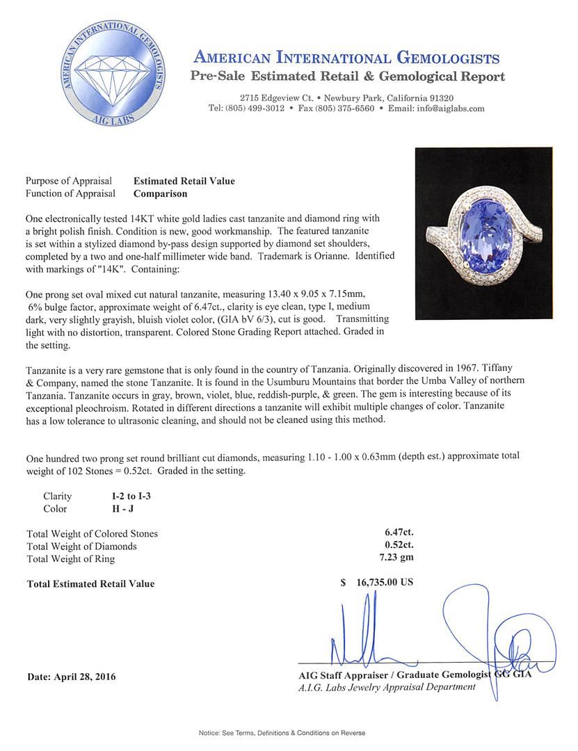One electronically tested 14KT white gold ladies cast tanzanite and diamond ring with a bright polish finish. The featured tanzanite is set within a stylized diamond by-pass design supported by diamond set shoulders, completed by a two and one-half millimeter wide band. Trademark is Orianne. Identified with markings of "14K". Condition is new, good workmanship. Containing: One prong set oval mixed cut natural tanzanite, measuring 13.40 x 9.05 x 7.15mm, 6%. bulge factor, approximate weight of 6.47ct., clarity is eye clean, type I, medium dark, very slightly grayish, bluish violet color, (GIA bV 6/3), cut is good. Transmitting light with no distortion, transparent. Colored Stone Grading Report attached. Graded in the setting. Tanzanite is a very rare gemstone that is only found in the country of Tanzania. Originally discovered in 1967. Tiffany & Company, named the stone Tanzanite. It is found in the Usumburu Mountains that border the Umba Valley of northern Tanzania. Tanzanite occurs in gray, brown, violet, blue, reddish-purple, & green. The gem is interesting because of its exceptional pleochroism. Rotated in different directions a tanzanite will exhibit multiple changes of color. Tanzanite has a low tolerance to ultrasonic cleaning, and should not be cleaned using this method. One Hundred Two prong set round brilliant cut diamonds, measuring 1.10 - 1.00 x 0.63mm (depth est.) approximate total weight of 102 Stones = 0.52ct. Graded in the setting. Clarity: I-2 to I-3. Color: H - J. Total Weight of Colored Stones 6.47ct. Total Weight of Diamonds 0.52ct. Total Weight of Ring 7.23gm. AIG Appraised at $16,735.00.