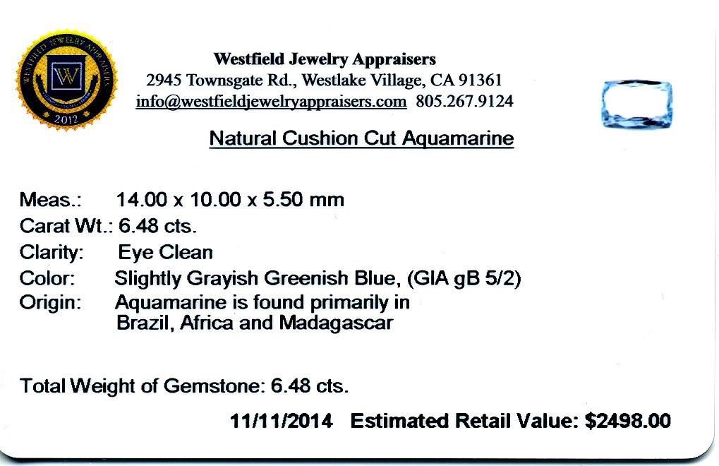 6.48ct. Natural Cushion Cut Aquamarine Westfield Appraised at $2,498.00.