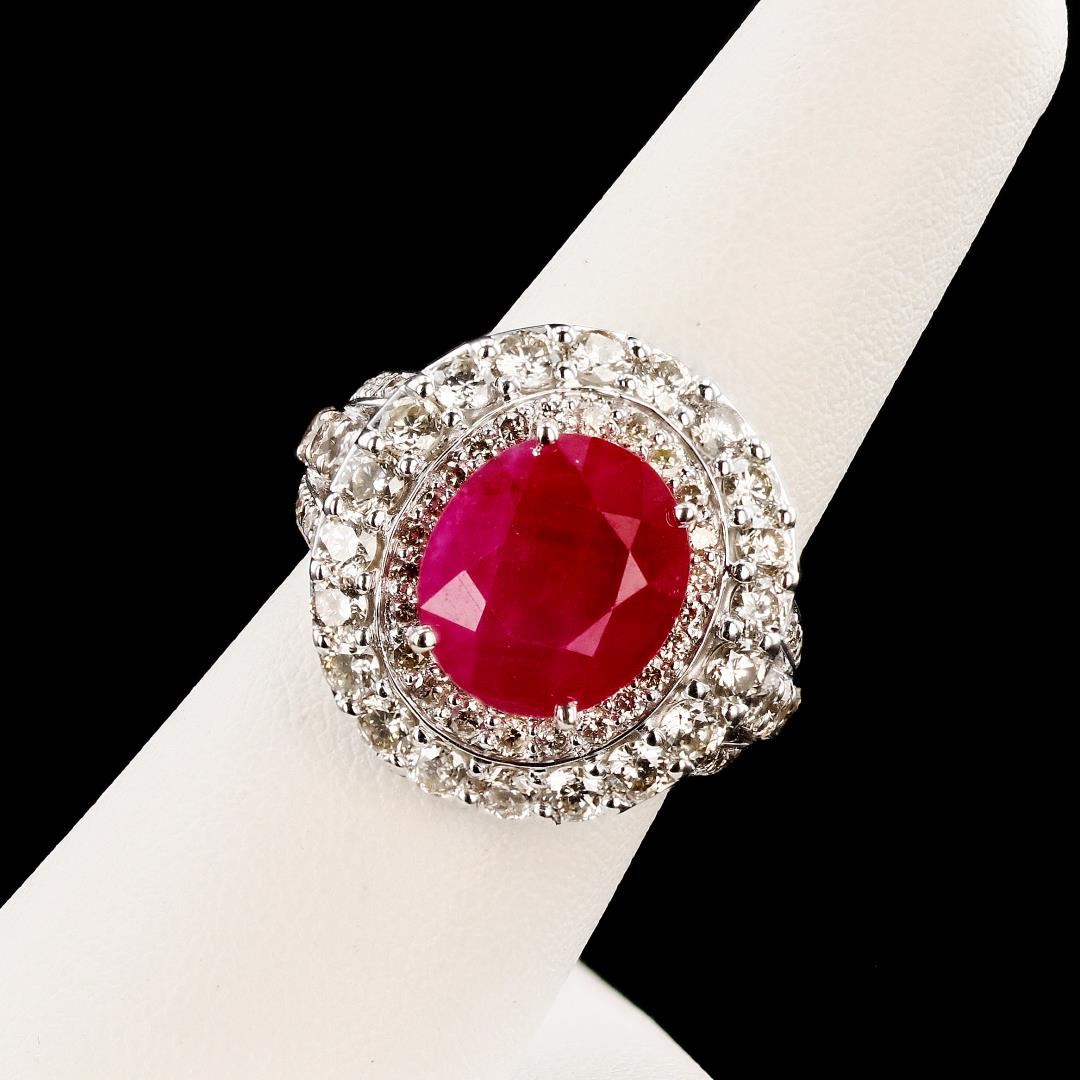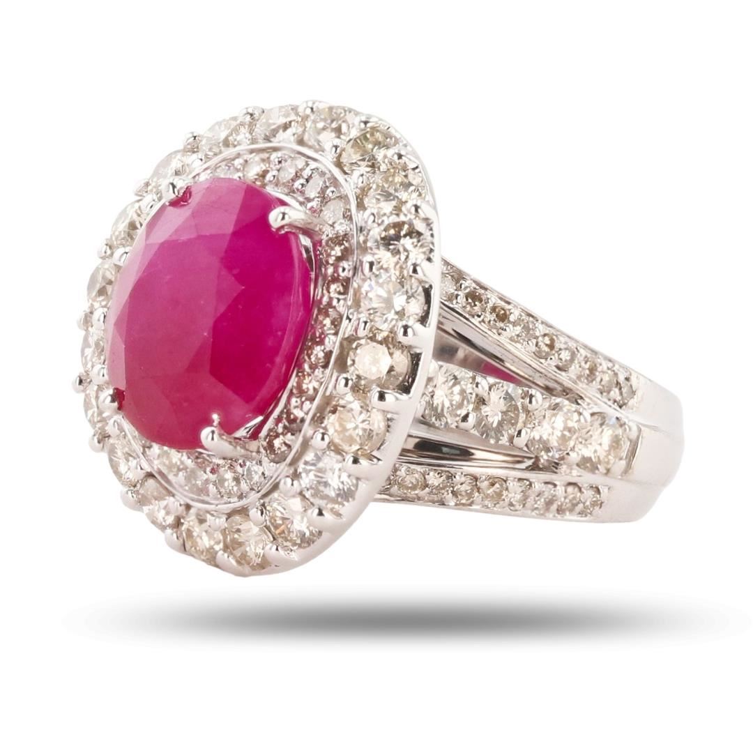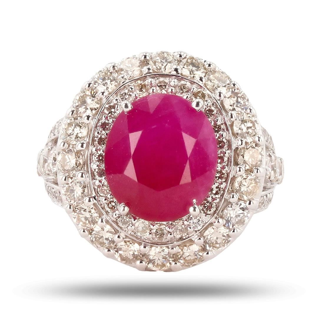 One polished, stamped, and tested 14K white gold ring with a bright finish. The ring is mounted with 1 genuine GIA certified Burmese Ruby center stone weighing 6.48 carats, and 88 genuine round diamonds weighing approximately 2.36 carats. This item weighs