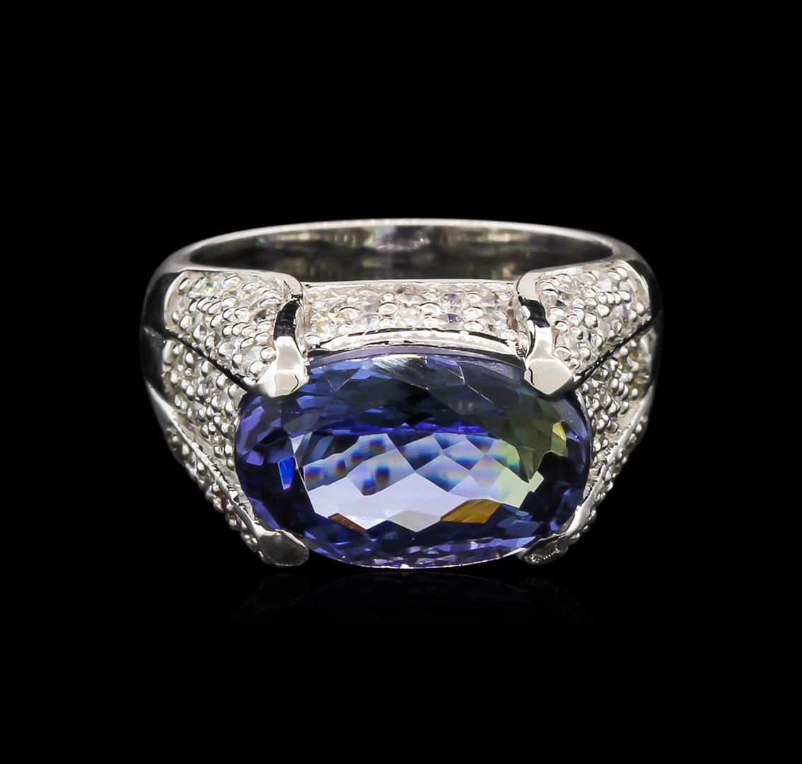 One electronically tested 14KT white gold lady's cast fashion ring with a tapered shank with a bright polish finish. The featured lady's ring has a 4.27 millimeter wide shank. Identified with markings of "K14". Condition is new, good workmanship. Containing: One prong set oval modified brilliant cut natural tanzanite, measuring 13.95 x 9.01 x 6.30mm, 15% bulge factor, approximate weight of 6.48ct., clarity is eye clean, type I, medium light, slightly grayish, bluish violet color, (GIA bV 4/2), cut is good. Transmitting light with no distortion, transparent. Colored gemstones are presumed to have been subjected to commonly used enhancement processes. Graded in the setting. Eighty-Two prong set round brilliant cut diamonds, measuring 1.50 - 1.40 x 0.94mm (depth est.) approximate total weight of 82 Stones = 1.00 ct. Graded in the setting. Clarity: SI-2 to I-1. Color: H - I. Cut Good. Total Weight of Colored Stones 6.48ct. Total Weight of Diamonds 1.00 ct. Total Weight of Ring 8.40gm. GAS Appraised.
