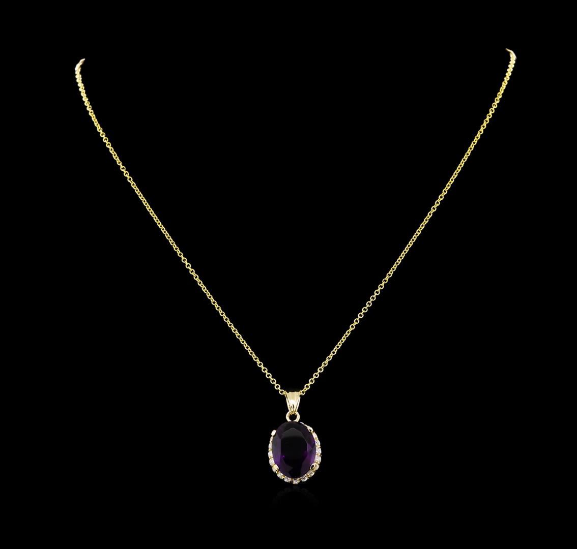 One pendant with chain featuring: 14KT yellow gold weighing 2.75 grams containing one amethyst with a total weight of 6.48ct and diamonds with a total weight of 0.65ct.