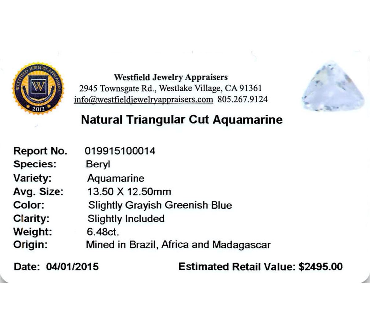 One triangle cut natural aquamarine exact weight 6.48ct., clarity is slightly included, type I, medium, slightly grayish, very slightly greenish blue color, (GIA vslgB 5/2), cut is good. Westfield Appraised at $2,495.00.