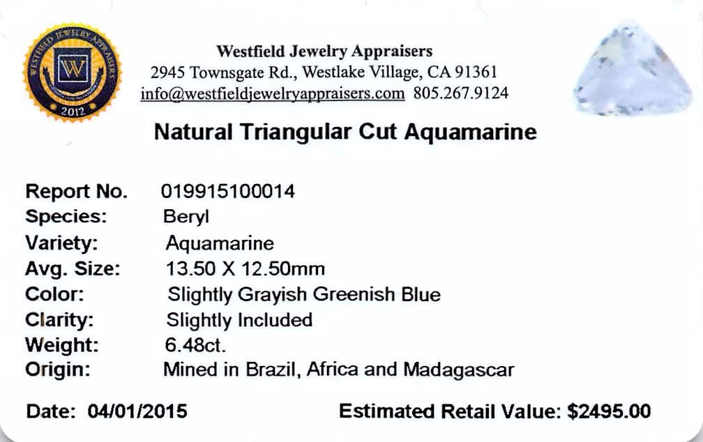 One triangle cut natural aquamarine exact weight 6.48ct., clarity is slightly included, type I, medium, slightly grayish, very slightly greenish blue color, (GIA vslgB 5/2), cut is good. Westfield Appraised at $2,495.00.