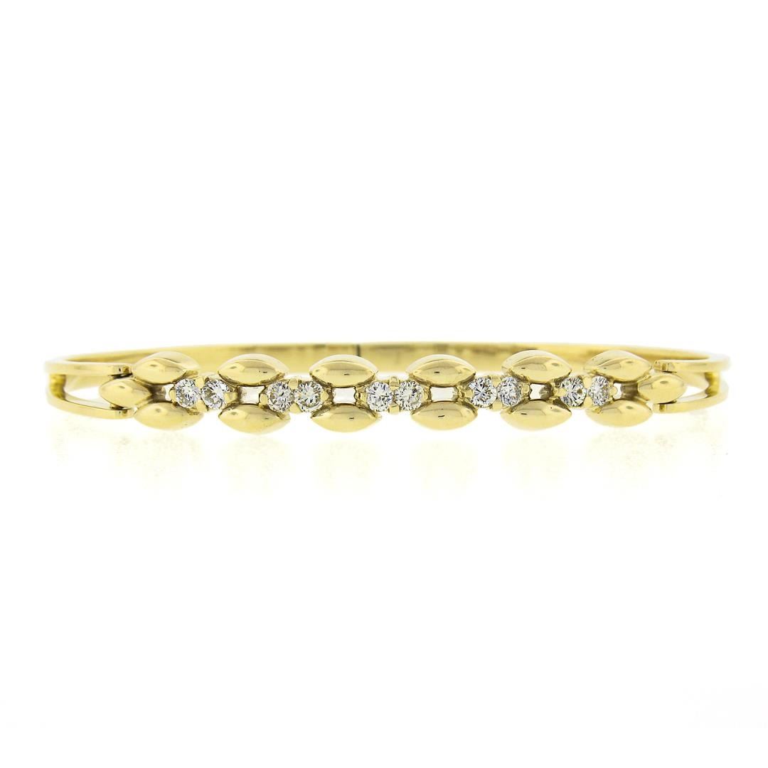 A solid 14k yellow gold open bangle bracelet, with 10 round brilliant cut natural diamonds (G/H - VS2/SI1 ; 0.60ctw). It weighs a total of 12.96 grams, measures 6.9mm wide, and measures 6.5 inches in length.