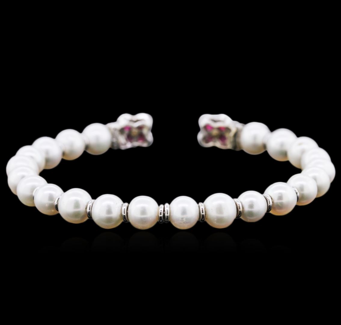 One bangle bracelet featuring: 18KT white gold weighing 12.80 grams containing pearls measuring approximately 6.5-7mm, rubies with a total weight of 2.06ct, and 20 brilliant cut diamonds with a total weight of 0.18ct.