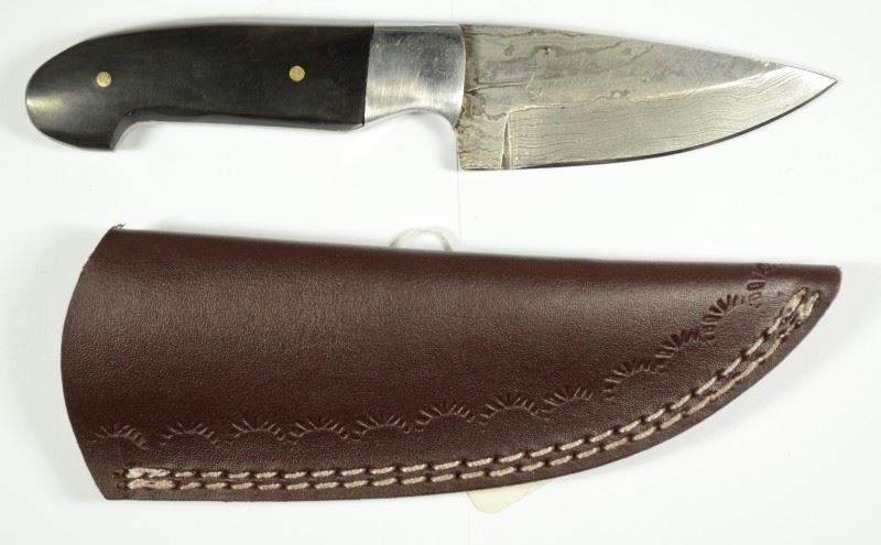 6.5 Inch Ladder Pattern Genuine Top Grade Damascus Steel Hunting Knife/Skinner with a Black Bull Horn Handle. 3" blade, 3.5" handle, genuine leather sheath. EST:$150-$200