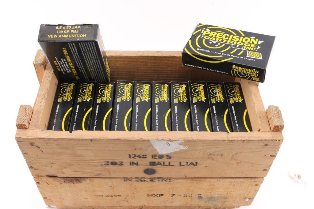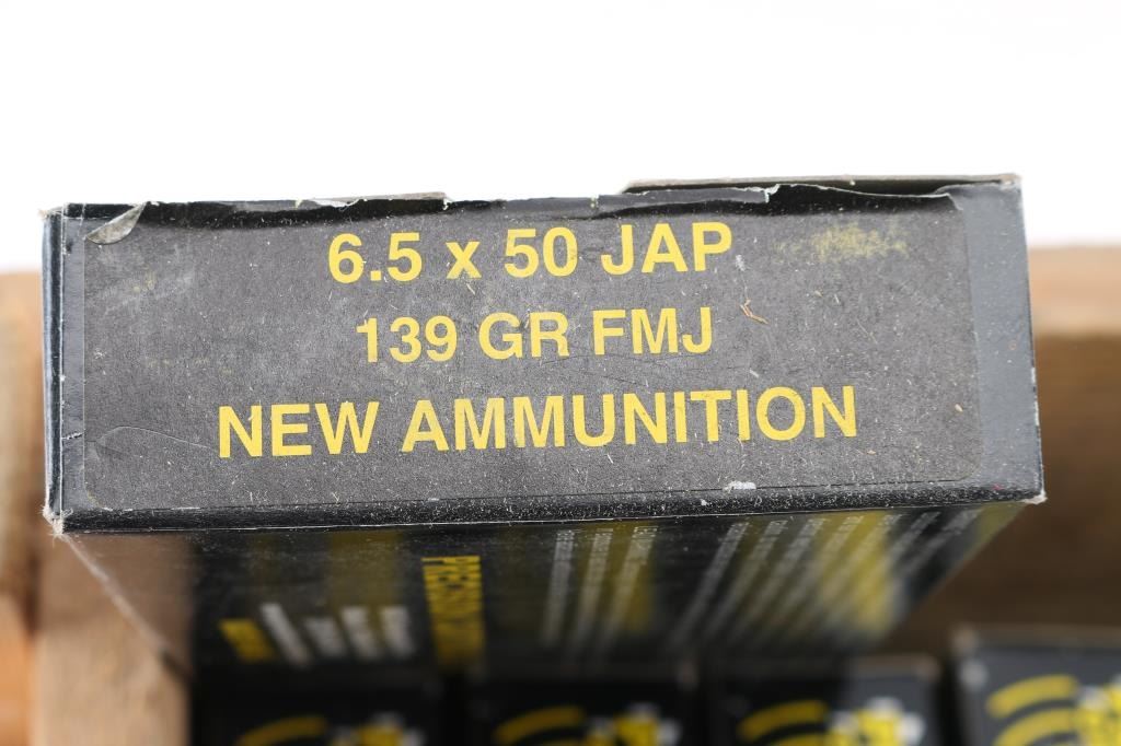 Approx. 480 rounds of 6.5 X 50mm Japanese factory new ammunition. Made in Indiana by Precision Cartridge Inc., 139 Gr. FMJ, all in 20 rd factory boxes, in wooden crate.