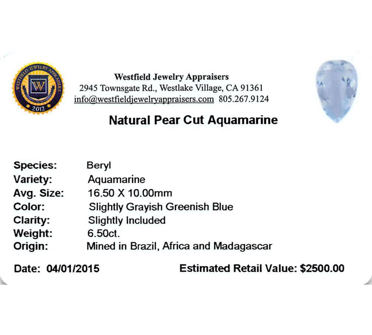 One pear cut natural aquamarine exact weight 6.50ct., clarity is slightly included, type I, medium, slightly grayish, very slightly greenish blue color, (GIA vslgB 5/2), cut is good. Westfield Appraised at $2,500.00.