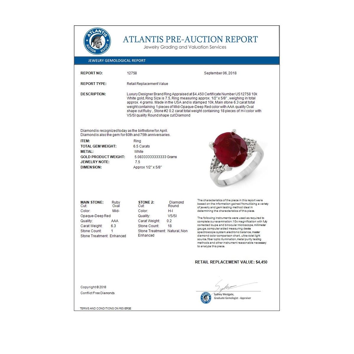 REF-67X6T -12758 ---- 6.50 CTW Ruby & Diamond Ring 10K White Gold ---- Luxury Designer Brand Ring Appraised at $4,450 Certificate Number US12758 10k White gold, Ring Size is 7.5, Ring measuring approx. 1/2" x 5/8" , weighing in total approx. 4 grams. Made in the USA and is stamped 10k, Main stone 6.3 carat total weight containing 1 pieces of Mid-Opaque-Deep Red color with AAA quality Oval shape cut Ruby , Stone #2 0.2 carat total weight containing 18 pieces of H-I color with VS/SI quality Round shape cut Diamond